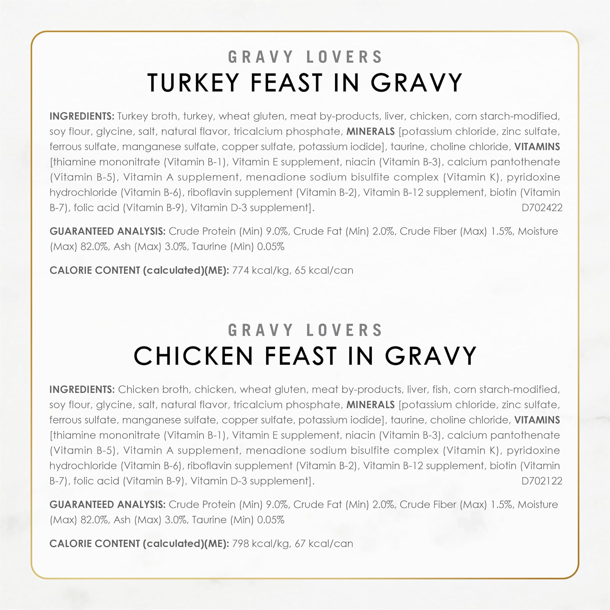 - ארוחת מזון לחתולים עשירה בחלבון ואי אפשר לעמוד בפניה של Fancy Feast Gravy Lovers, המציעה ארוחה גורמה של הודו, עוף או בקר, עם ארומה מפתה ורוטב קליל ומלוח.