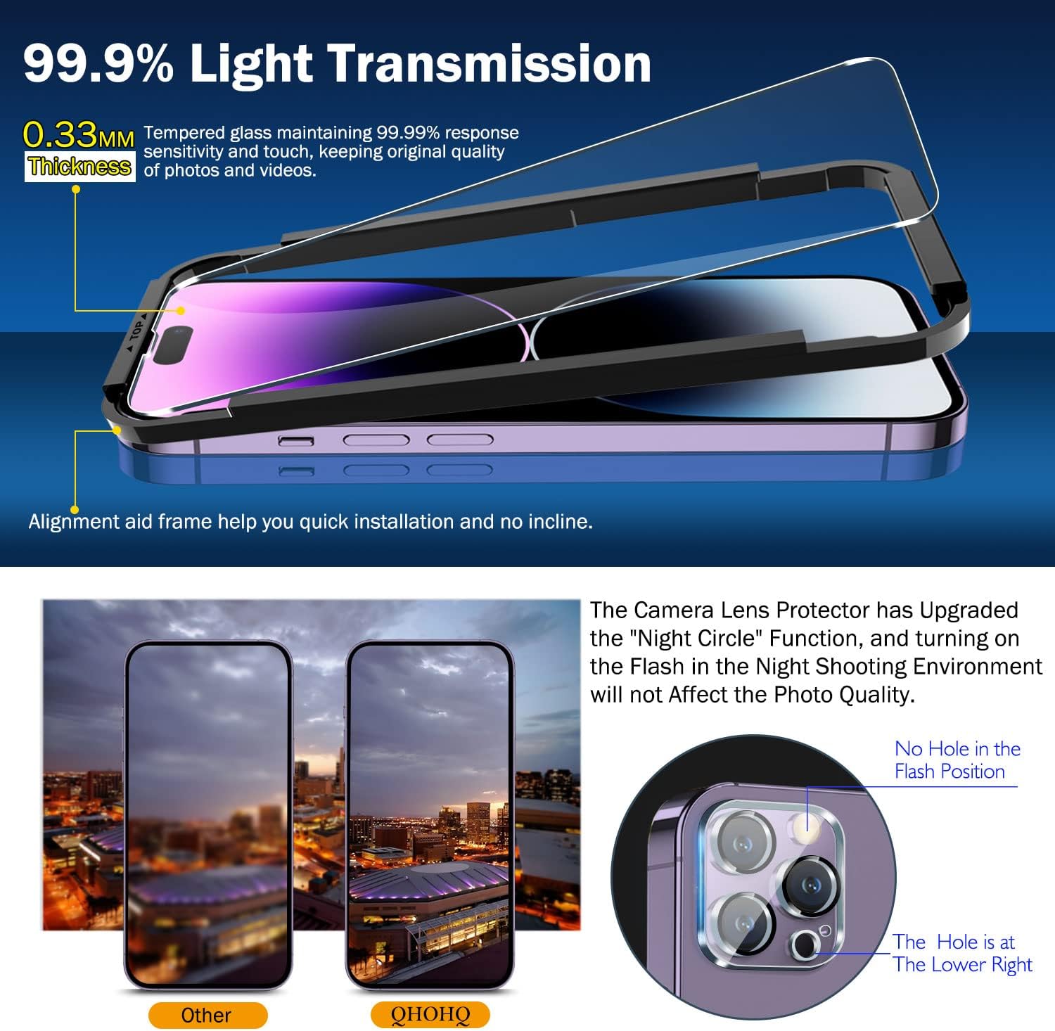 מגני מסך QHOHQ מארז 3 לאייפון 14 פרו מקס 6.7 אינץ' עם 3 מגני עדשת מצלמה מזכוכית מחוסמת, Ultra HD, קשיות 9H, עמיד בפני שריטות, מתאים לכיסוי
