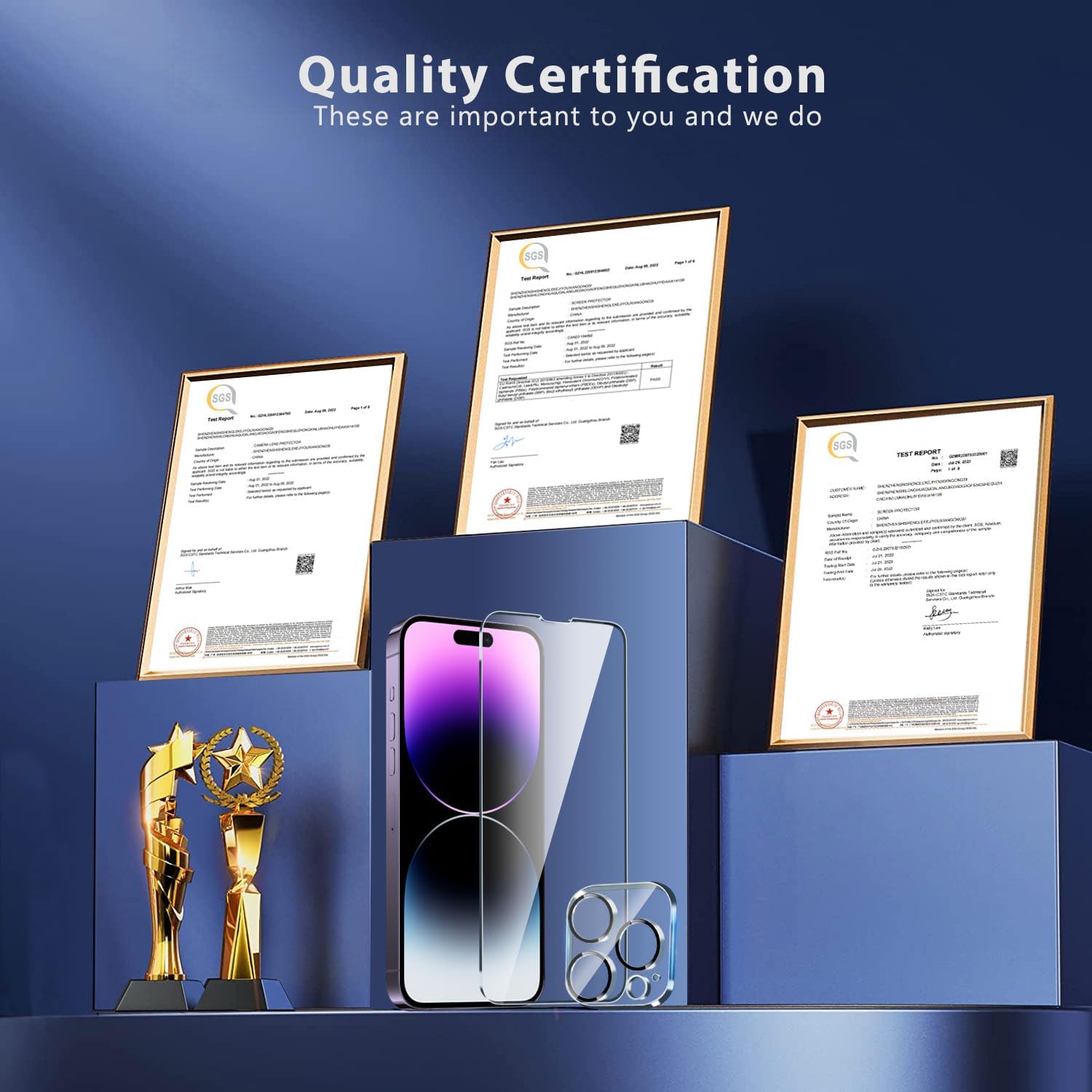 - [אישור RoHS לבדיקת איכות הסביבה ונפילות]: זכוכית מחוסמת QHOHQ וכיסוי מצלמה עם בדיקת קשיות 9H, מגן מסך מאושר שיכול לעמוד בנפילה מגובה של 1.8 מטר מבלי לפגוע במסך הטלפון, ולהגיע לבדיקת העברת אור של 99.99%. במקביל, המוצרים עברו את דוח בדיקת הגנת הסביבה של RoHS (מספר אישור: GZHL2208123848SD ו- GZHL2208123847SD), ועומדים בתקני איכות הסביבה הבינלאומיים.