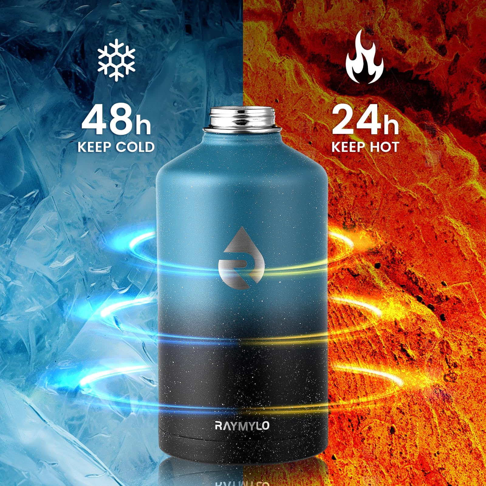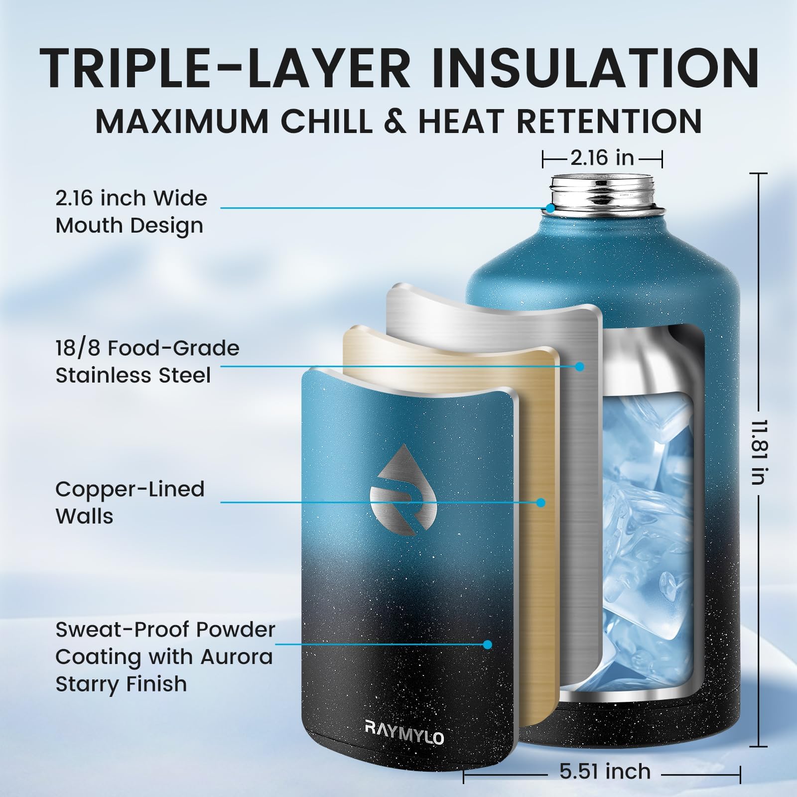 - 48H Cold & 24H Hot Triple Insulation: RAYMYLO 128 oz Insulated Water Bottle's copper-plated triple-wall vacuum design keeps drinks icy cold for 48hrs and warm for 24hrs. This Aurora Starry Sky stainless steel water bottle is designed for efficient hydration. One gallon water bottle keep icy-cold drinks at your fingertips!