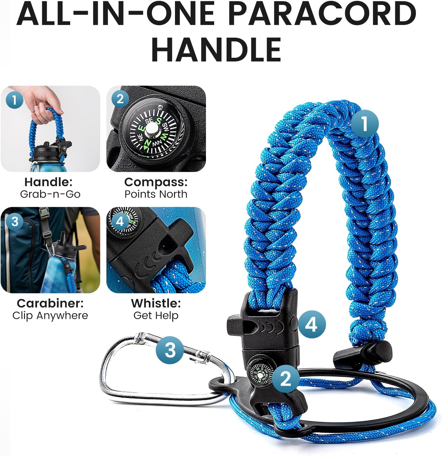 - Adventure Ready Paracord Handle: RAYMYLO 1/4 gallon water jug features a stylish color-coordinated paracord handle with a built-in compass and carabiner clip. This reusable water bottle's paracord handle is lightweight, durable, and perfect for hands-free carrying during hikes, cycling, or camping. Grab & go for spontaneous adventures under the stars!