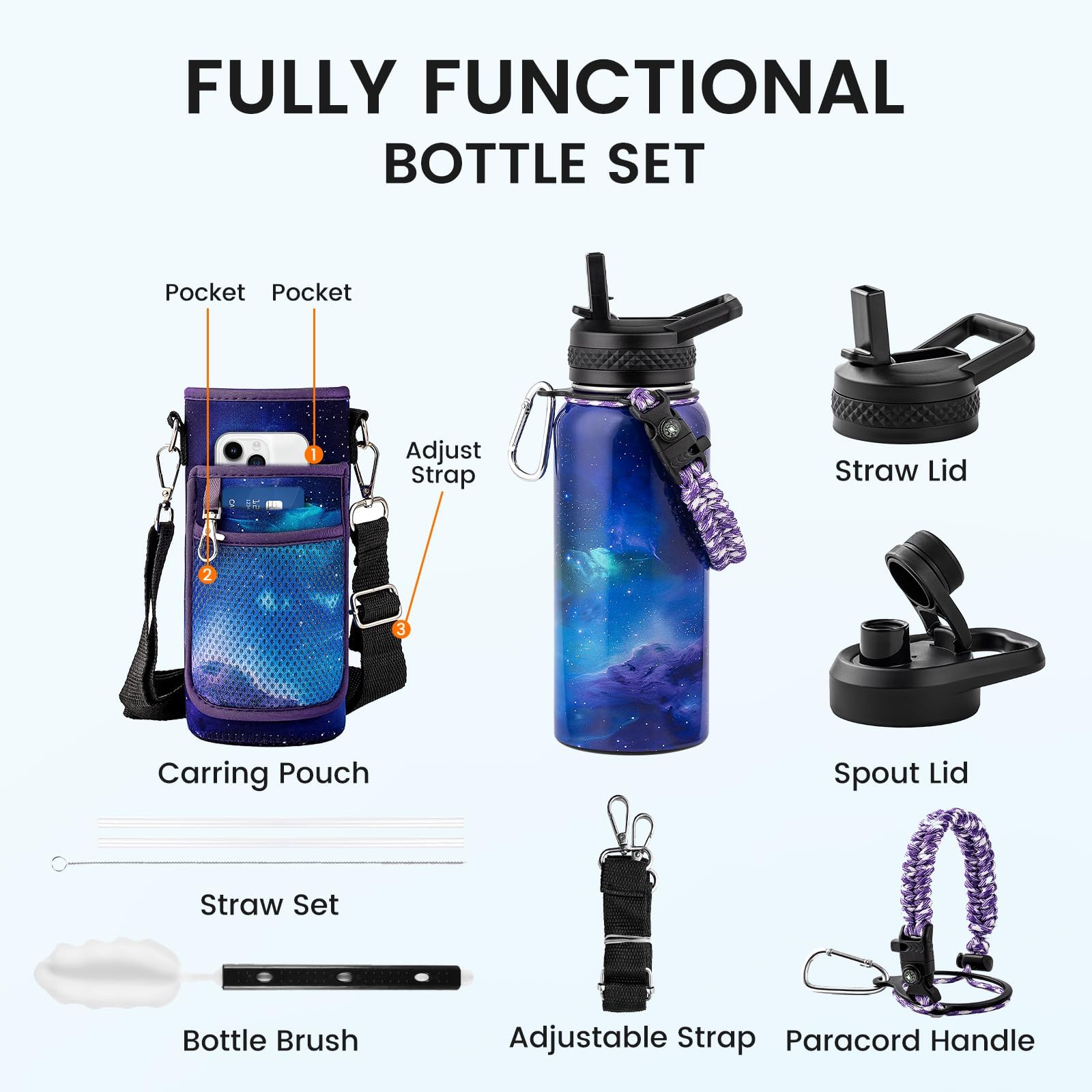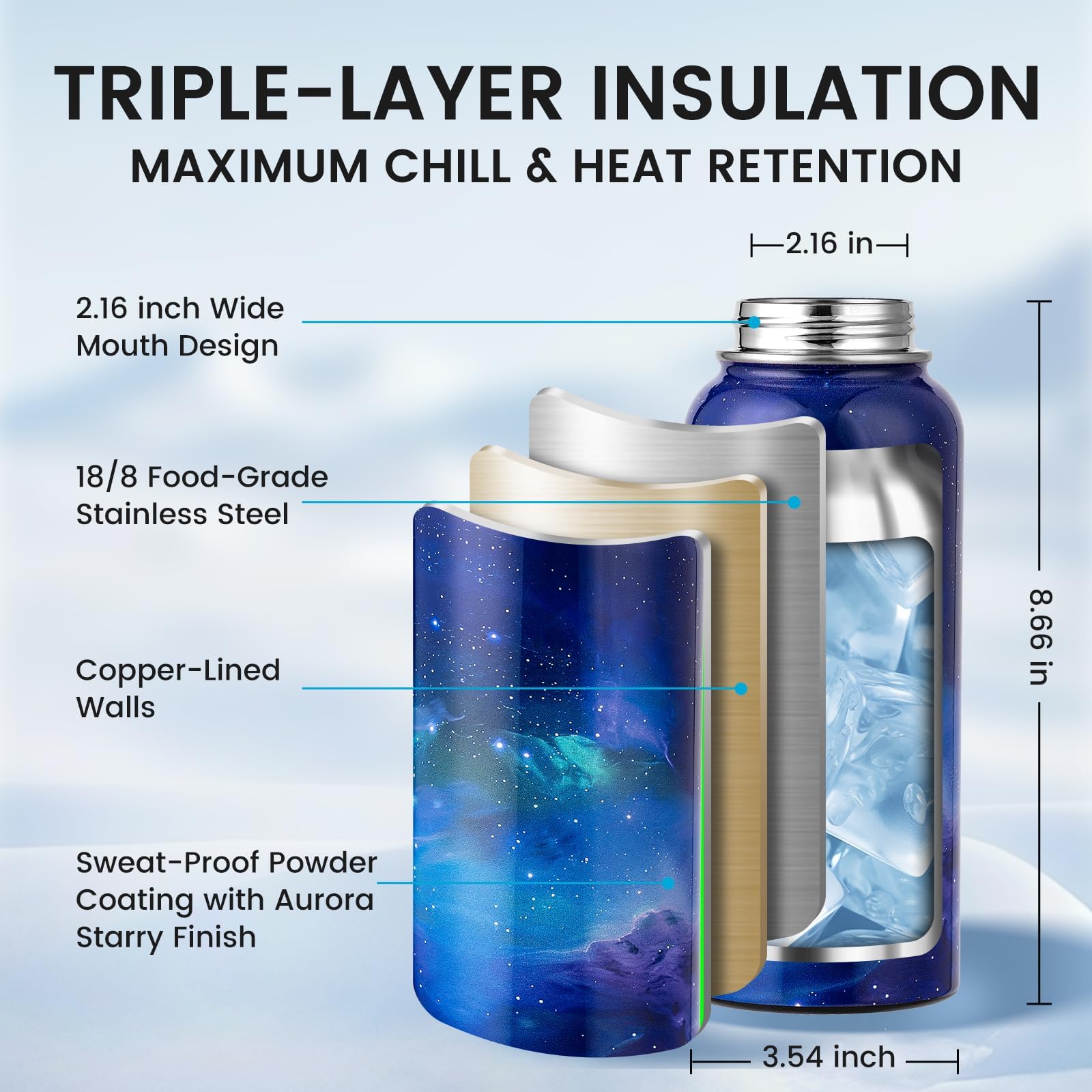 - 48H Cold & 24H Hot Triple Insulation: RAYMYLO 32 oz Insulated Water Bottle's copper-plated triple-wall vacuum design keeps drinks icy cold for 48hrs and warm for 24hrs. This Aurora Starry Sky stainless steel water bottle is designed for efficient hydration. 1/4 gallon water bottle keep icy-cold drinks at your fingertips!