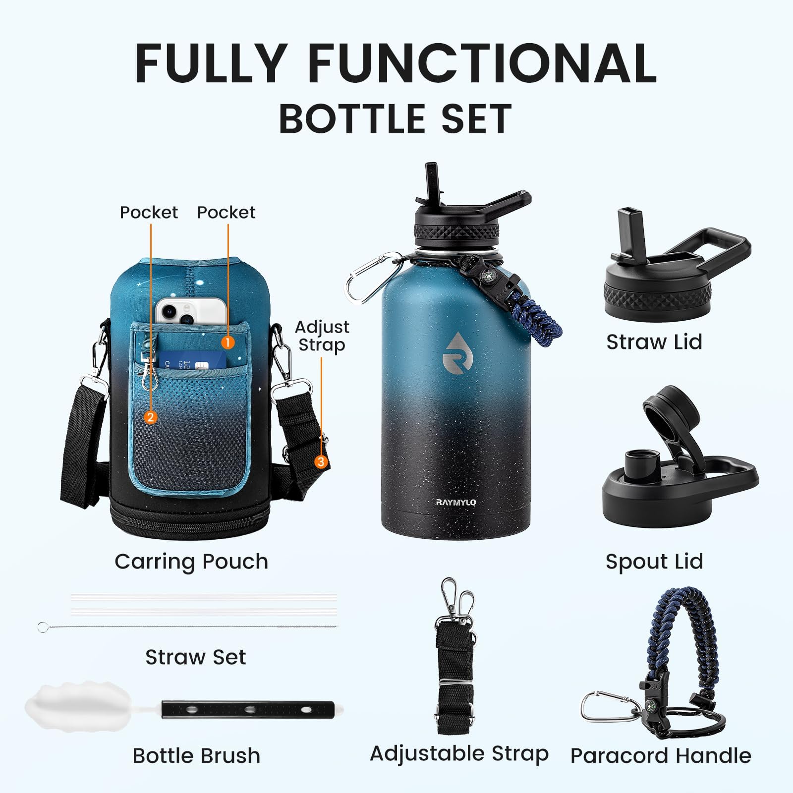 - What You'll Get: We offer Continuous After-sales Service and 100% customer satisfaction against any leakage or insulation failure. You purchase contains: RAYMYLO Insulated Water Bottle, Carrying Pouch with Adjustable Strap, Straw Lid with 2 Straws & Straw Brush, Spout Lid, Paracord Handle, Bottle Brush