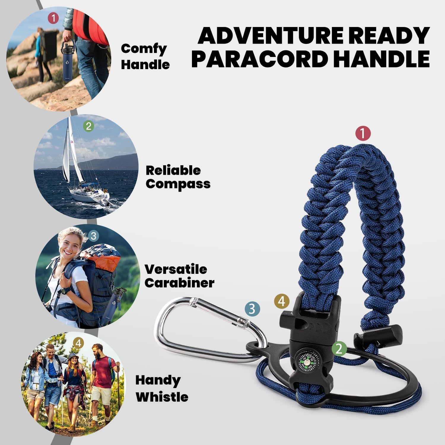 - Iconic Paracord Handle: This insulated water bottle comes with a beautiful hand knit nylon paracord in coordinated color with the water bottle. Configured with a compass and carabiner, this paracord handle is a must-have as a full functional camping / hiking flask