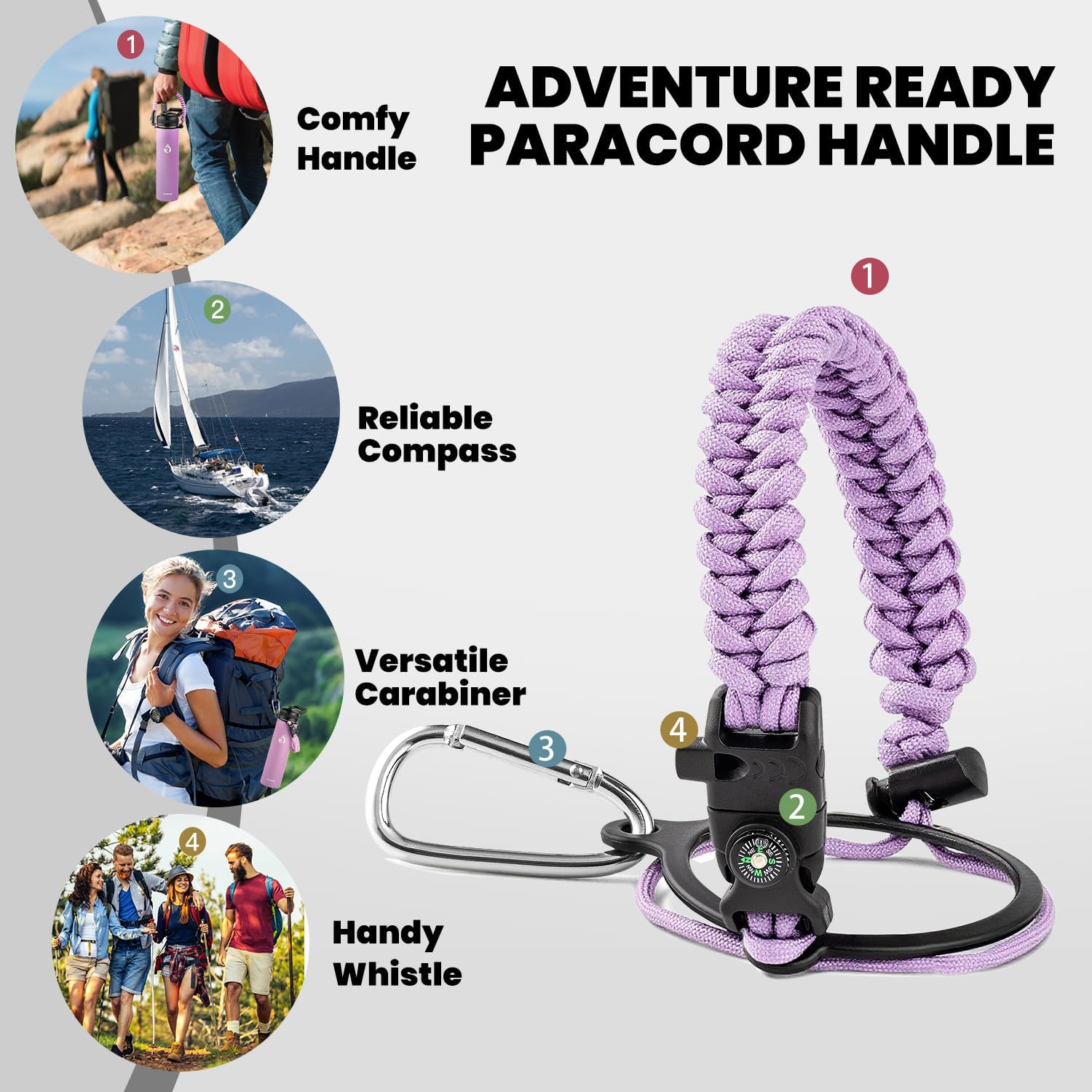 - Iconic Paracord Handle: This insulated water bottle comes with a beautiful hand knit nylon paracord in coordinated color with the water bottle. Configured with a compass and carabiner, this paracord handle is a must-have as a full functional camping / hiking flask