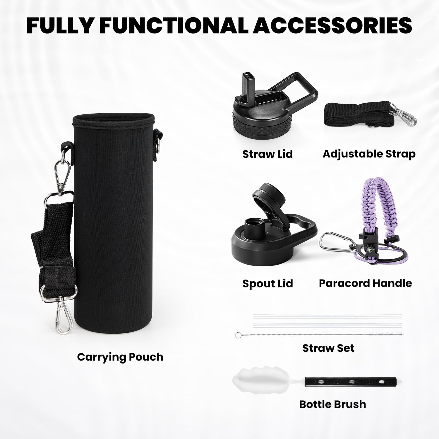 - What You'll Get: We offer Continuous After-sales Service and 100% customer satisfaction against any leakage or insulation failure. You purchase contains: RAYMYLO Water Bottle, Carrying Pouch, Straw Lid with 2 Straws & Straw Brush, Spout Lid, Paracord Handle, Bottle Brush