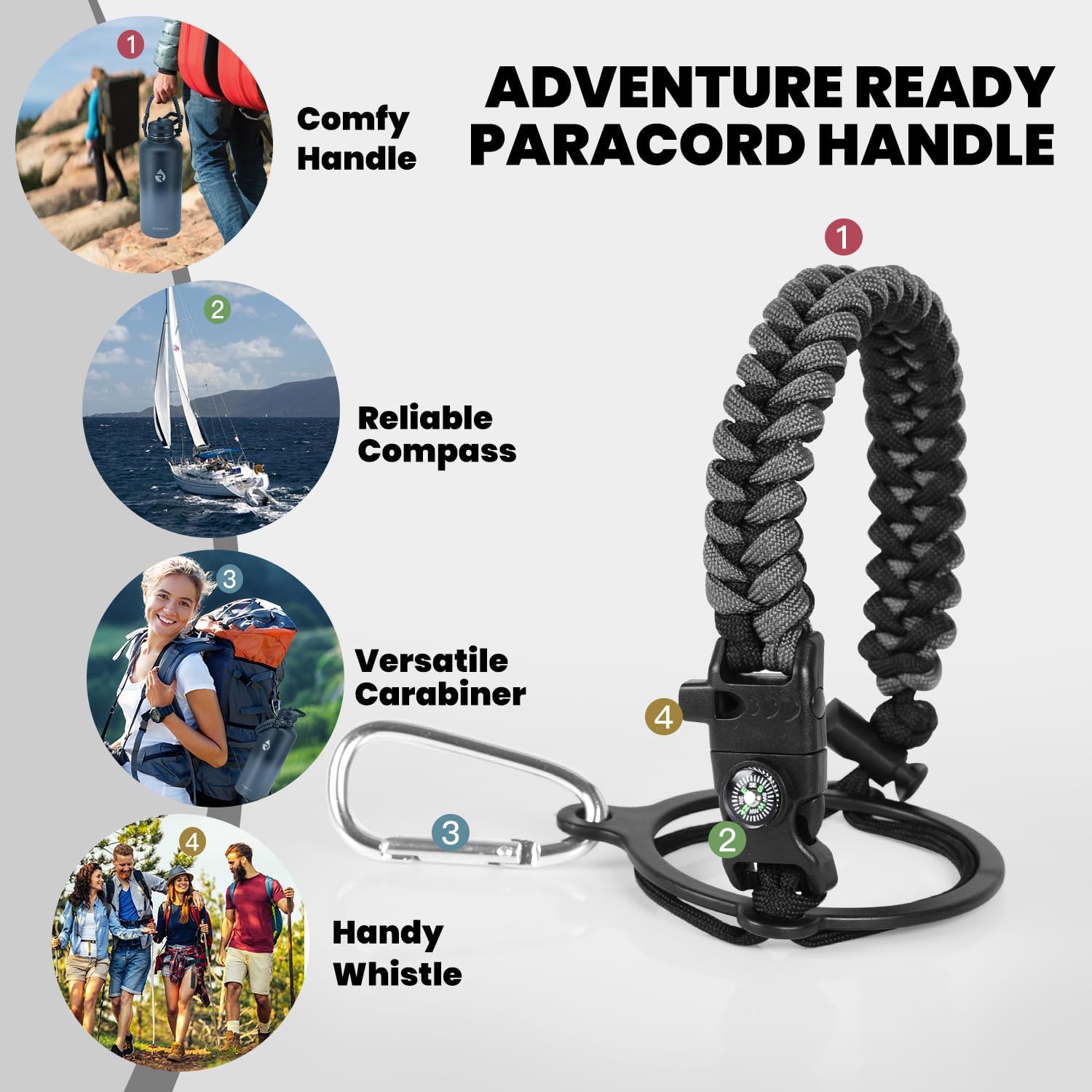 - Iconic Paracord Handle: This insulated water bottle comes with a beautiful hand knit nylon paracord in coordinated color with the water bottle. Configured with a compass and carabiner, this paracord handle is a must-have as a full functional camping / hiking flask
