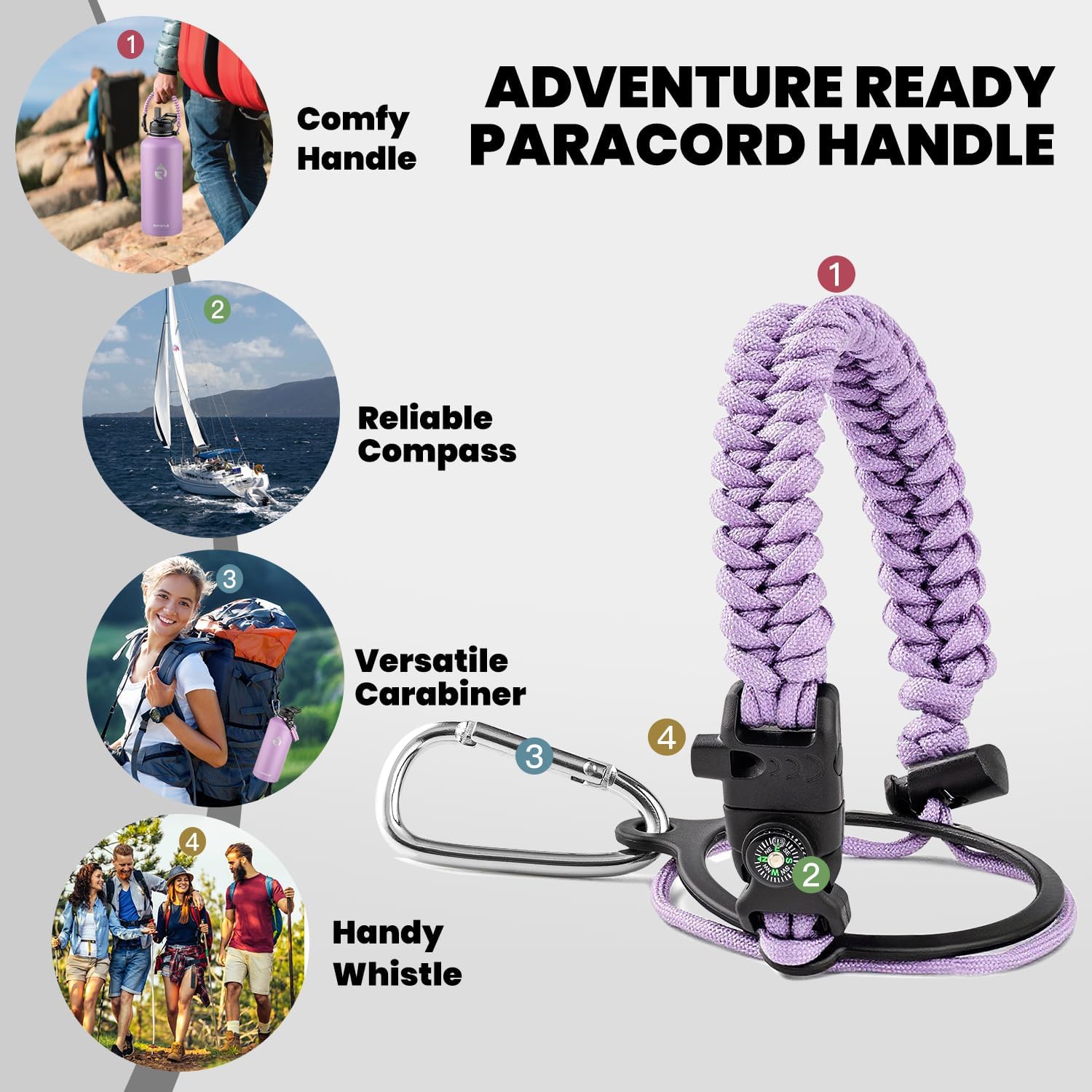 - Iconic Paracord Handle: This insulated water bottle comes with a beautiful hand knit nylon paracord in coordinated color with the water bottle. Configured with a compass and carabiner, this paracord handle is a must-have as a full functional camping / hiking flask
