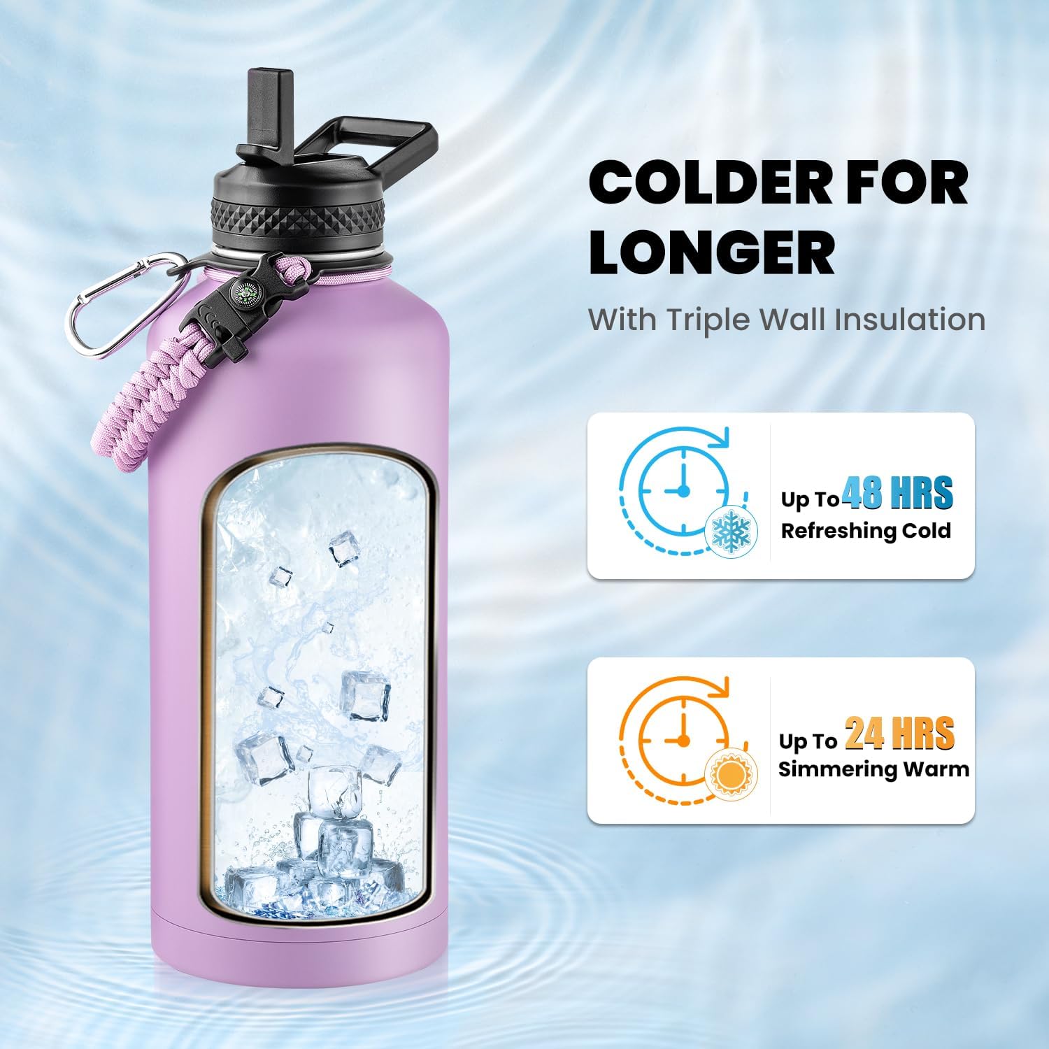 RAYMYLO Insulated Water Bottle 87 oz, Triple Wall Vacuum Stainless Steel (Cold for 48 Hrs), Leak Proof & Non-BPA, Modern Water Flask Jug with Paracord Handle & Straw Spout Lids, Lilac