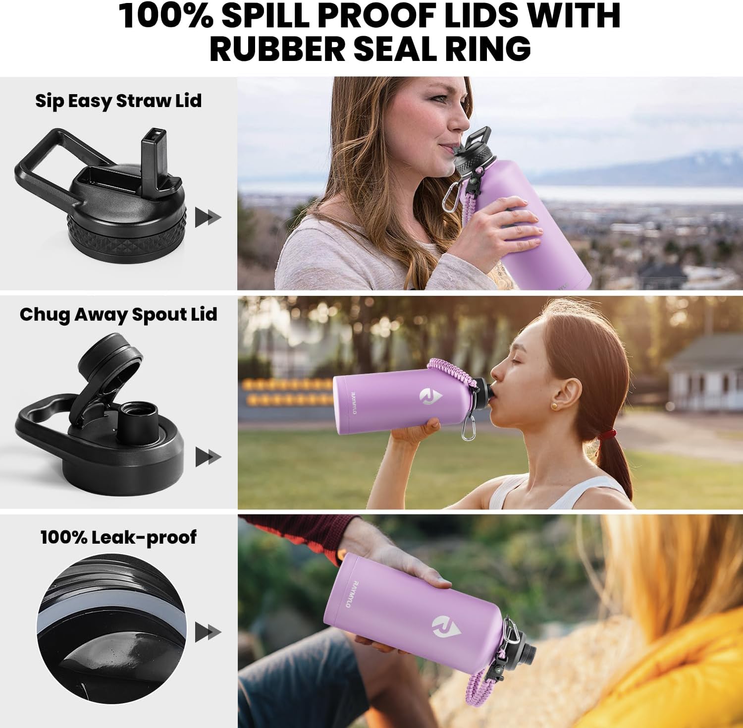 - Full Seal Leak-proof Lids: All scenario spout and straw lid with rubber seal ring ensures not a single drop leaks no matter how bumpy your journey gets.Straw lid allows for a quick refreshment without stopping you, while spout lid is great for proper hydration whenever you feel like a boost.Keeps your drinks fresh and spill-resistant on the go