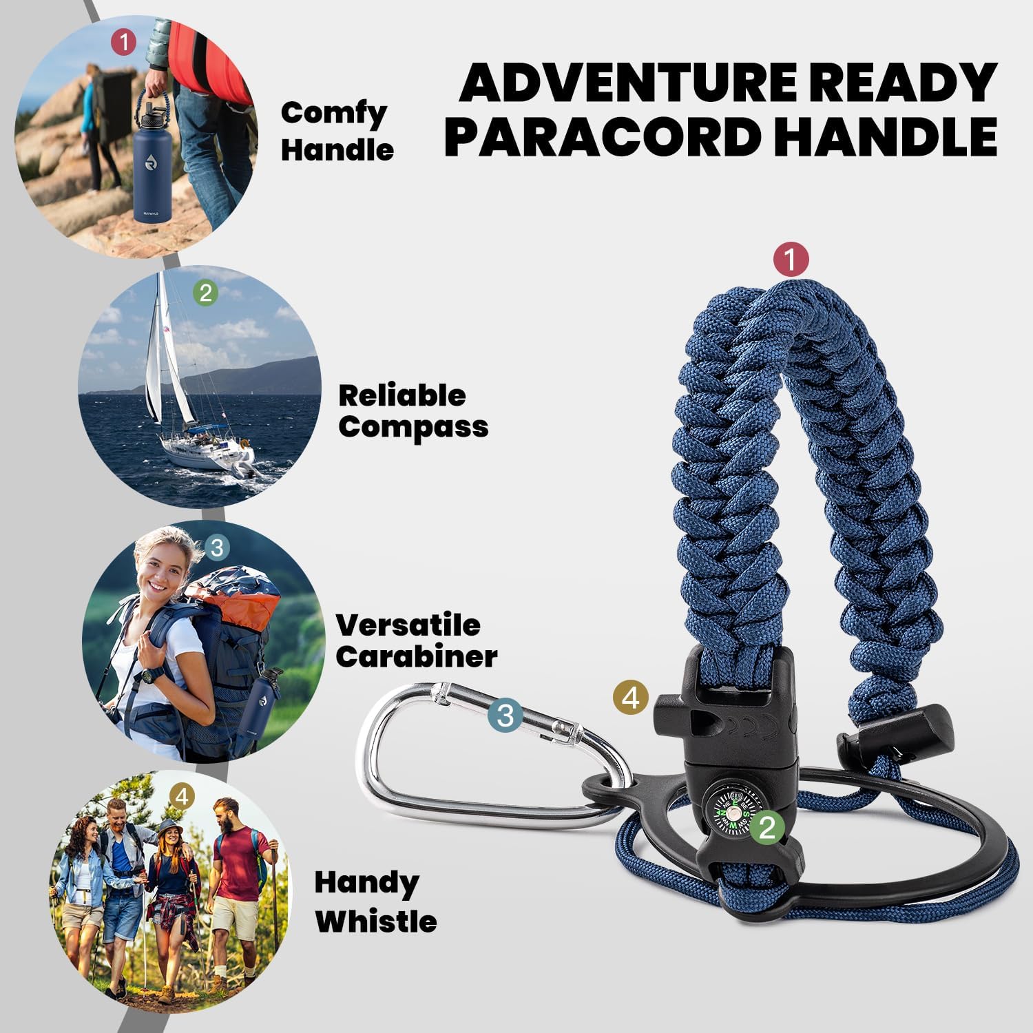 - Iconic Paracord Handle: This insulated water bottle comes with a beautiful hand knit nylon paracord in coordinated color with the water bottle. Configured with a compass and carabiner, this paracord handle is a must-have as a full functional camping / hiking flask