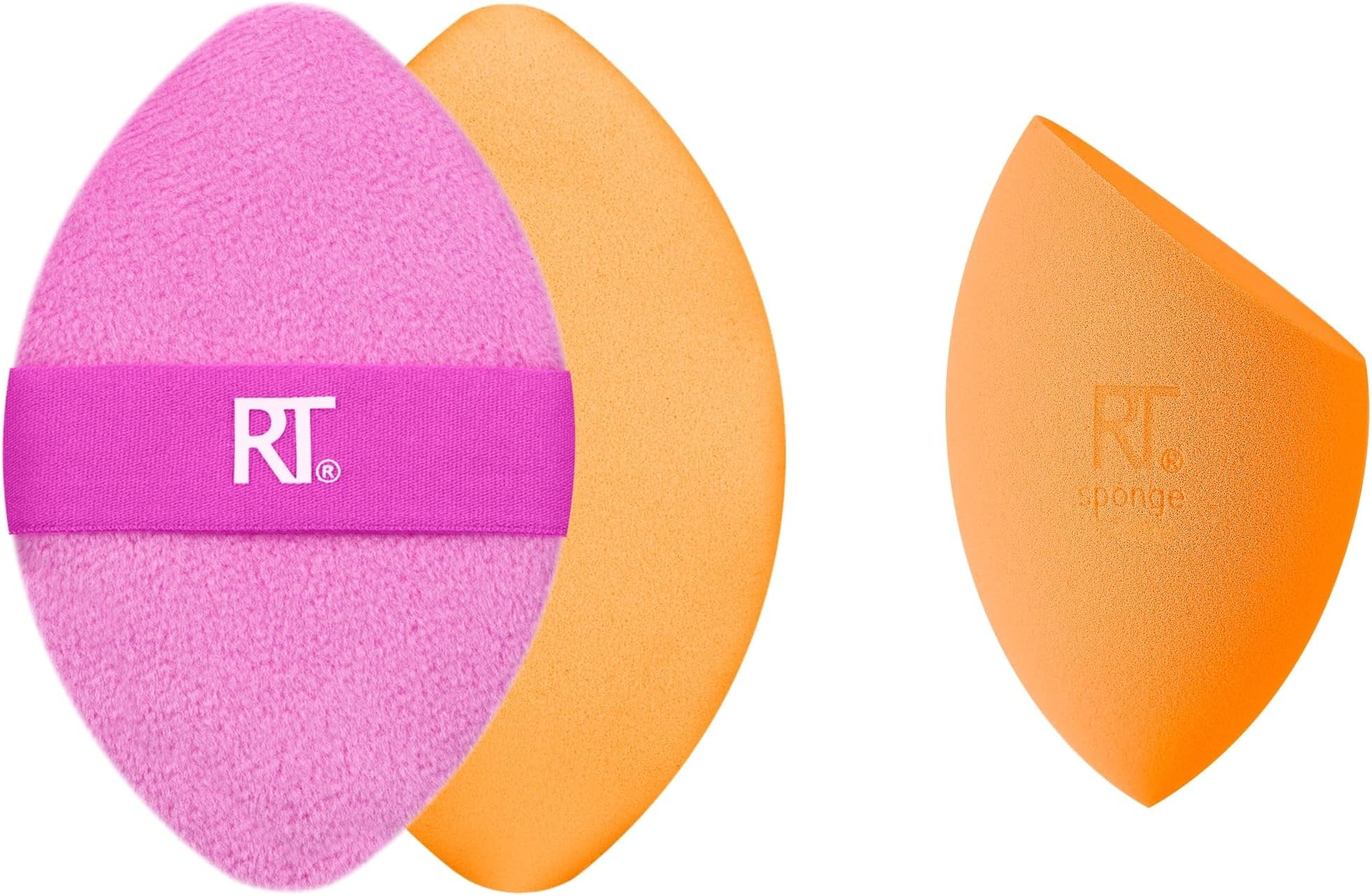 ספוגית איפור Miracle Complexion של Real Techniques + פאף פודרה Miracle 2 ב-1, ספוגית איפור וטפטוף דו-צדדי, לנוזלים, קרמים ופודרות, טבעוני וללא לטקס, 2 יחידות