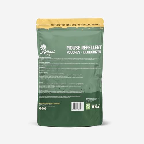 - תוצרת אמריקאית בגאווה: שקיות דוחה עכברים של Reliant Pet, המיוצרות בארה"ב, מגנות על אזורים של עד 6.5 מ"ר למשך 1-3 חודשים. סמכו על האיכות שלנו שתרחיק עכברים מחללים שלכם בקלות ובאמינות. דוחה עכברים טבעי לבית, דוחה עכברים חיצוני ודוחה עכברים חיצוניים.