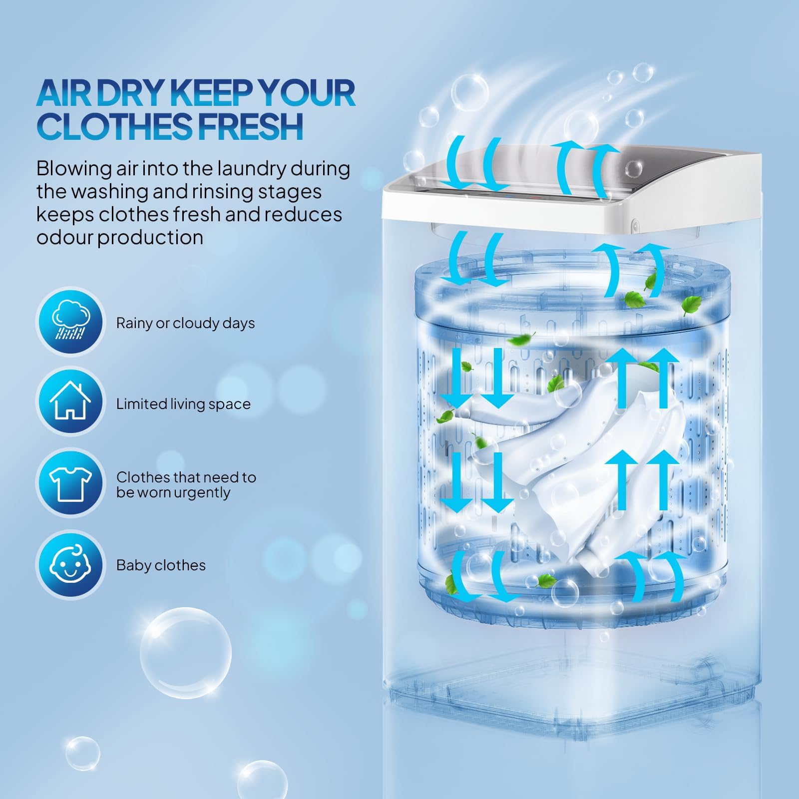 - 【ביצועי ניקוי מעולים】מכונת כביסה ניידת זו כוללת תוף פנימי ייחודי בדוגמת יהלום המפחית בלאי של הבגדים שלכם בעת הכביסה, תוך שיפור הניקיון והבטחת כביסה ללא רבב. פונקציית הייבוש באוויר מקדמת זרימת אוויר במהלך הכביסות, ומשאירה את הבגדים שלכם לא רק נקיים אלא גם רעננים.