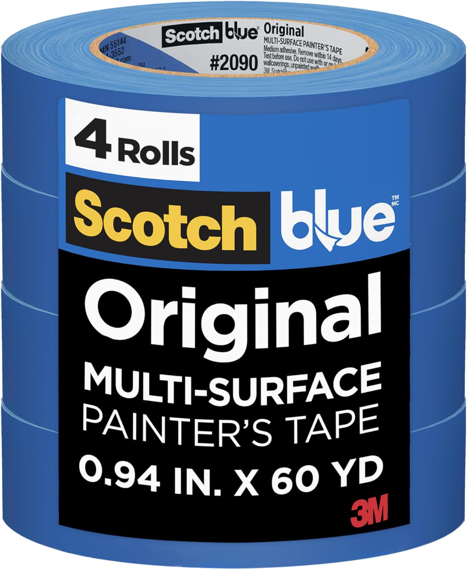 סרט צביעה רב-משטחי מקורי של ScotchBlue, 0.94 אינץ' x 60 יארד, 4 גלילים, כחול, סרט צבע מגן על משטחים ומסיר בקלות, סרט צביעה רב-משטחי לשימוש פנימי וחיצוני