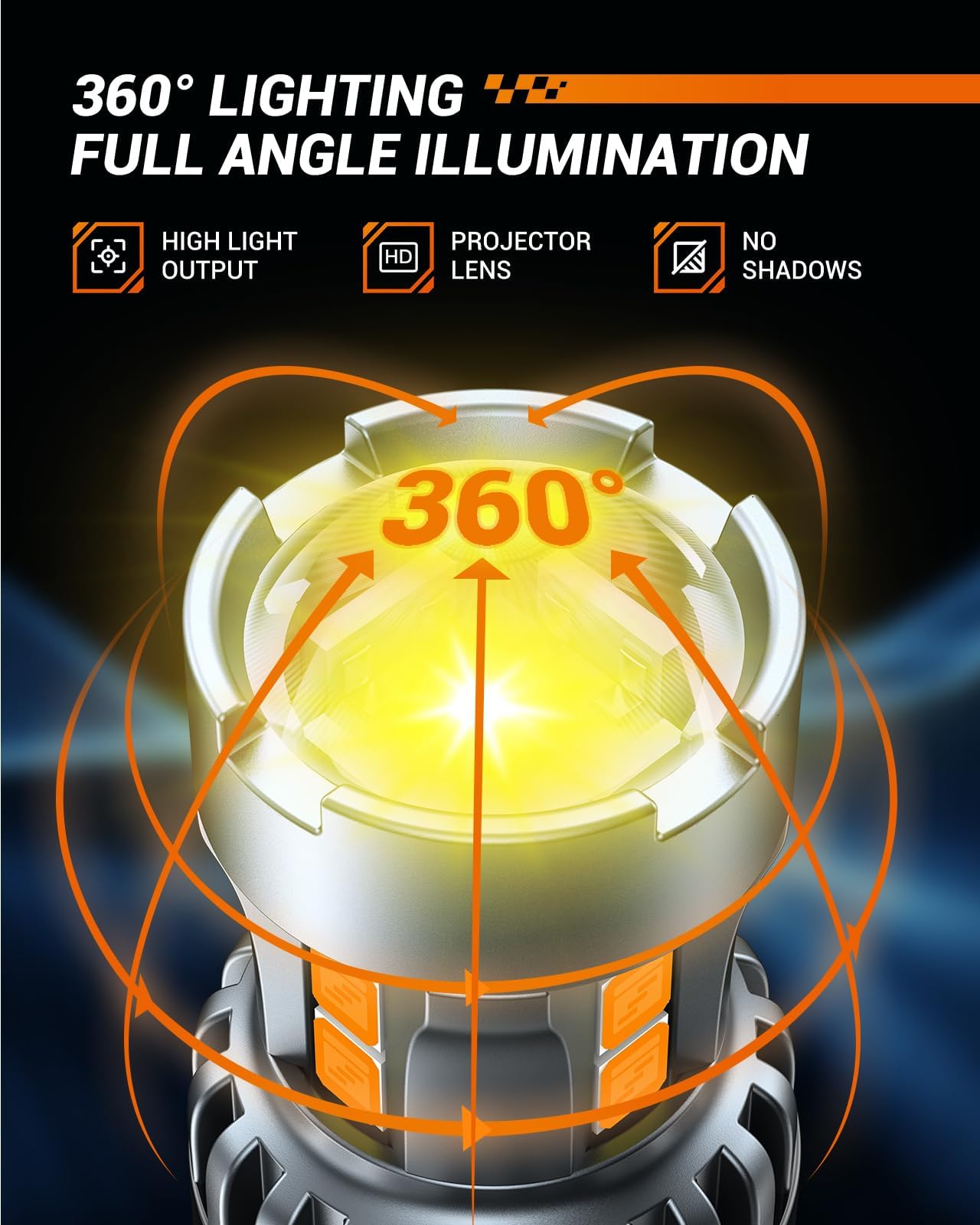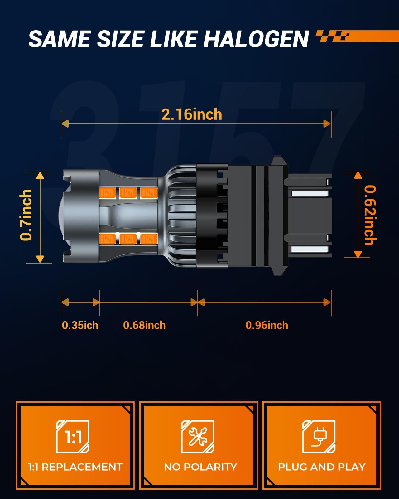 - 【הגדלת בהירות ב-600%】שבבי 3030-SMD משודרגים בעלי בהירות גבוהה משובצים במדויק בנורת LED 3157. זווית צפייה מלאה של 360°, ללא כתמים כהים, ללא צל, ומספקים פלט תאורה בצבע צהוב ענברי טהור לנראות ובטיחות מעולות לכל הכיוונים.