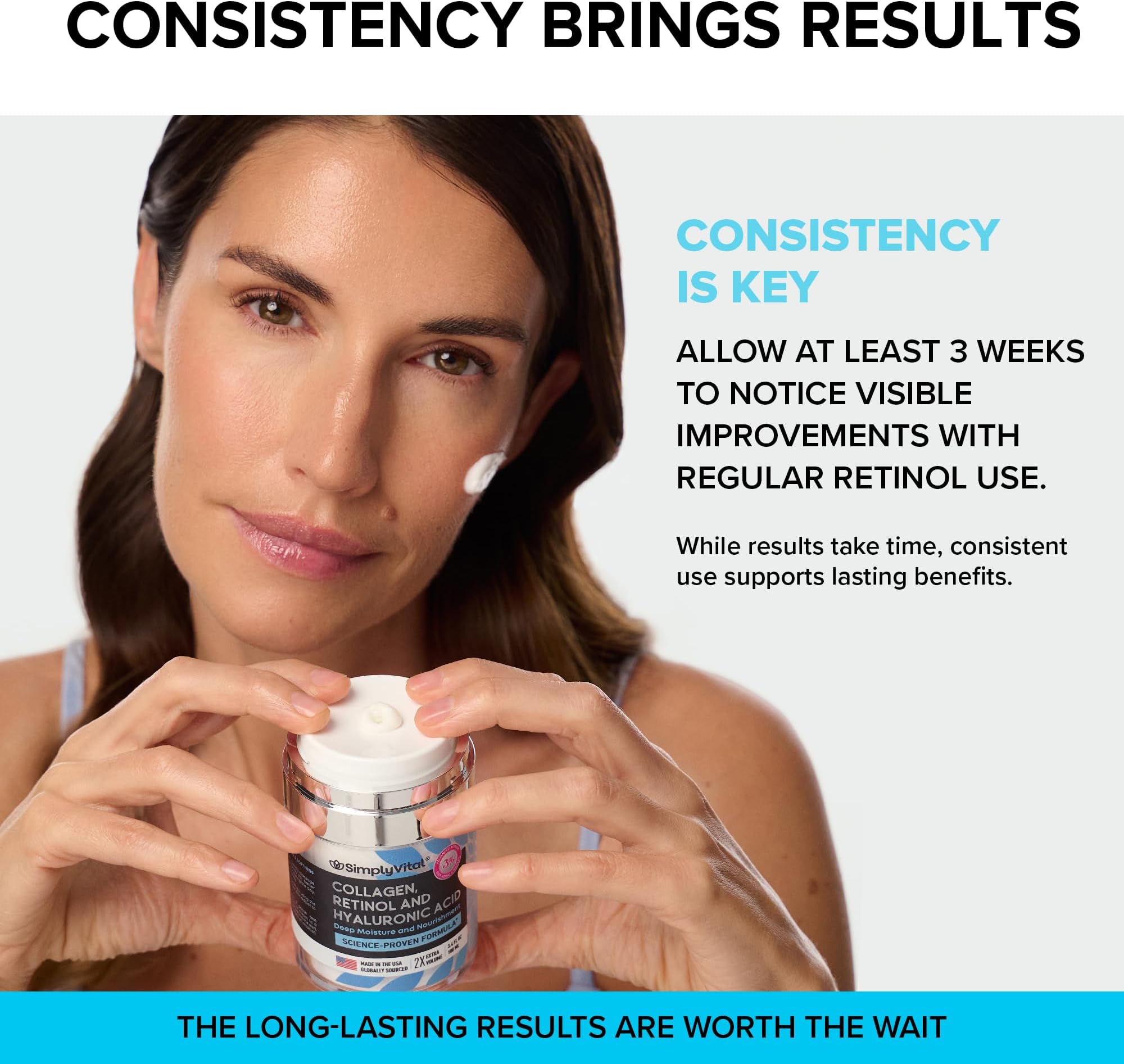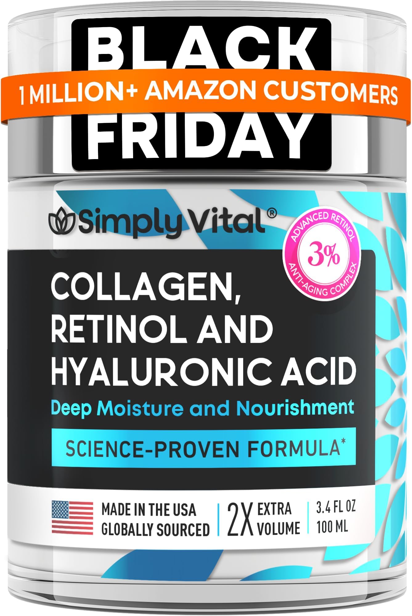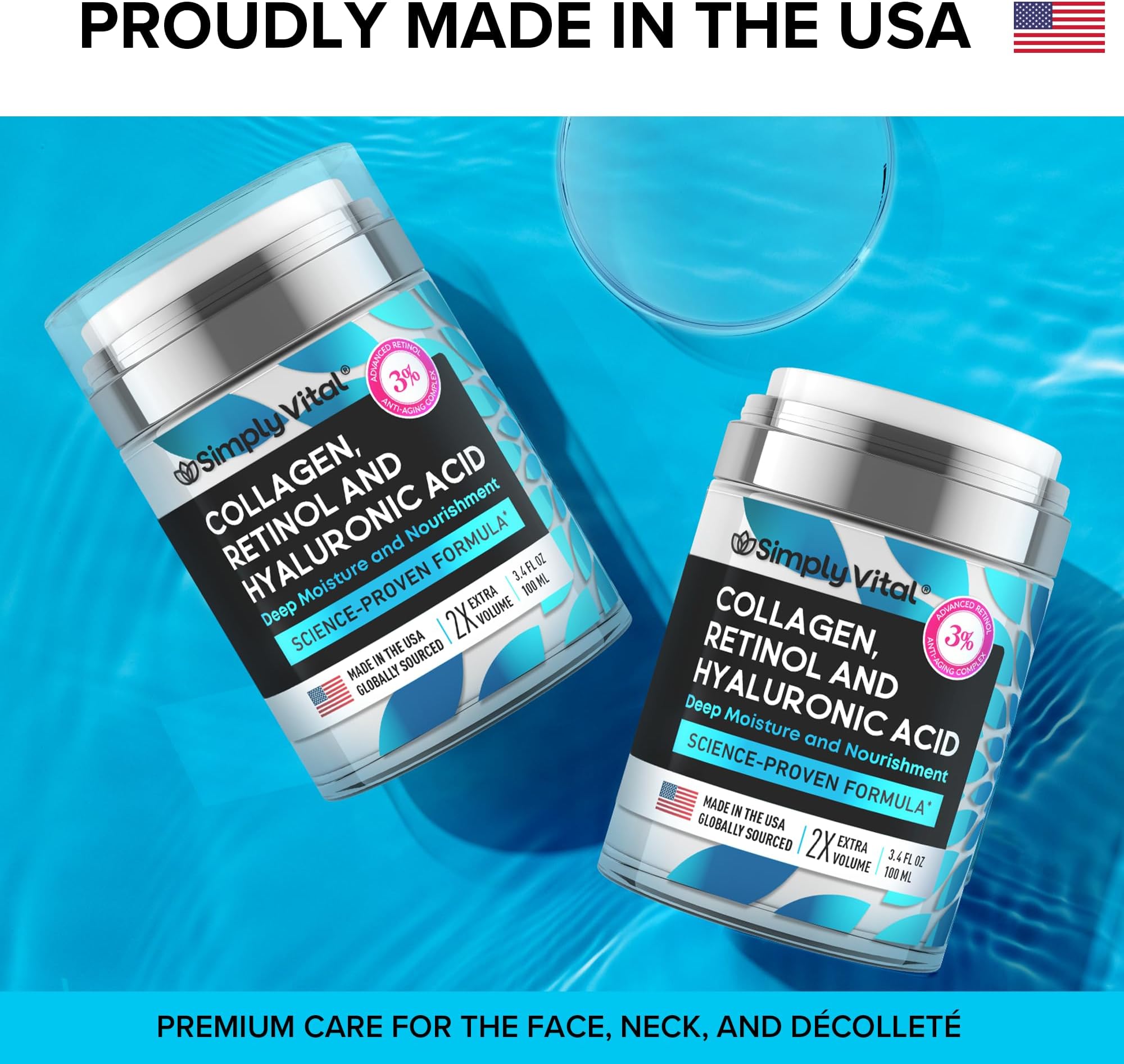 קרם קולגן, רטינול וחומצה היאלורונית SimplyVital - קרם רטינול אנטי אייג'ינג לפנים, צוואר ודקולטה - תוצרת ארה"ב - קרם פנים לחות יומי - 3.38 אונקיות נוזל