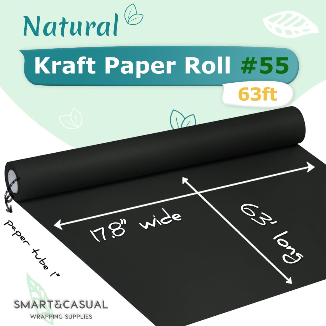 גליל נייר קראפט שחור SMART&CASUAL 17.8 אינץ' x 760 אינץ' (63 רגל) לעטיפת מתנות, לוח מודעות, זר פרחים, אמנות לילדים, כיסוי שולחן לחבילות, 80 גרם למ"ר, 55 ליברות (שחור, 17.8 אינץ' x 63 רגל)