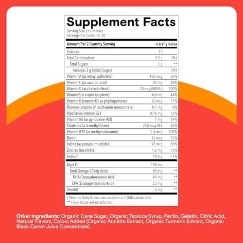 - עם 16 רכיבים תזונתיים לתמיכה בגוף הגדל*: הפורמולה שלנו, המבוססת על מדע, כוללת ויטמינים B12, A, E, K1 ויוד, כמו גם אומגה 3 DHA ו-EHA משמן אצות, מה שאומר שילדים מקבלים את היתרונות של מנה יומית של מולטי ואומגה, והכל במנה טעימה.