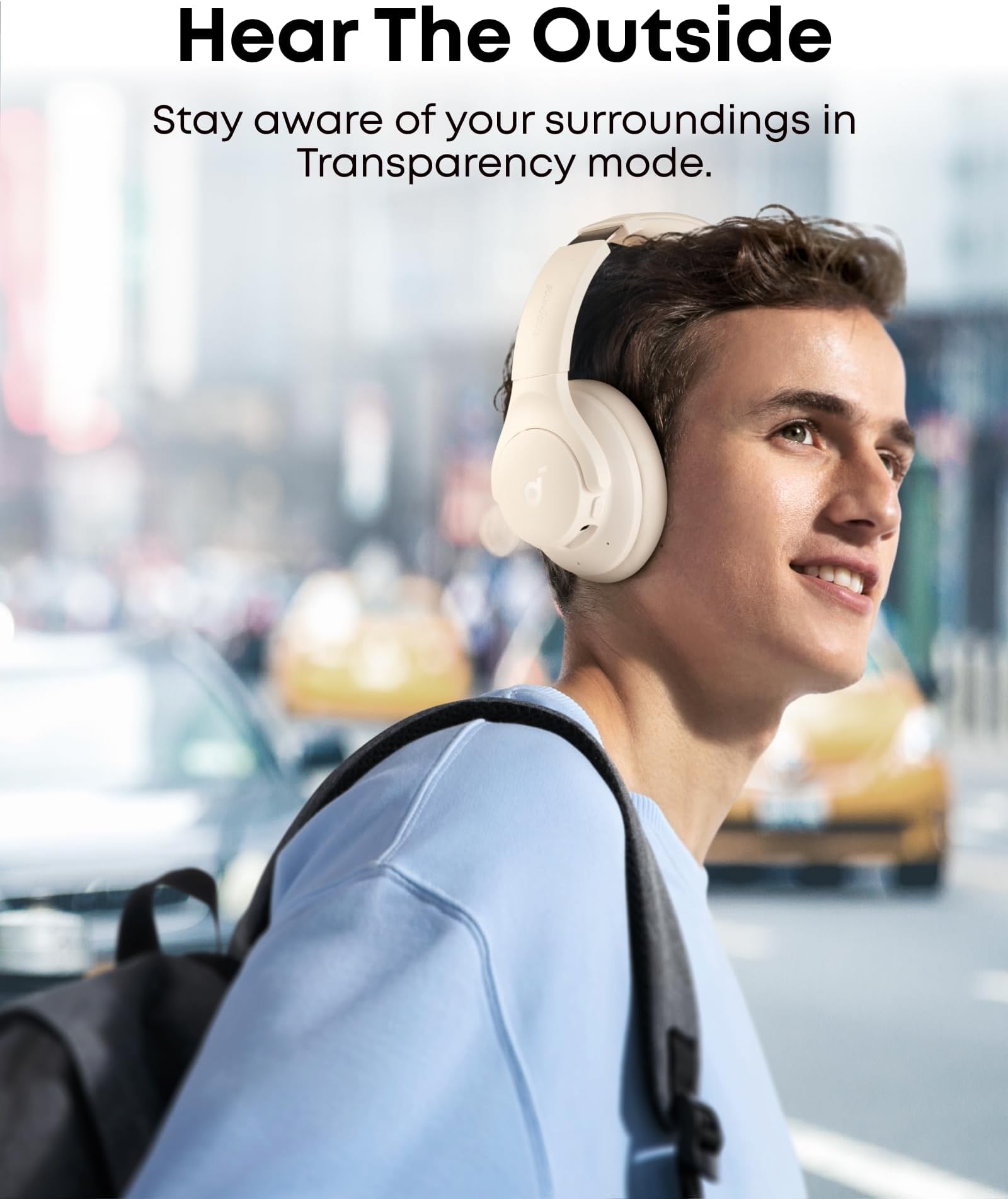 אוזניות היברידיות Soundcore by Anker Q20i עם מבטל רעשים אקטיבי, Bluetooth אלחוטיות מעל האוזן, זמן נגינה ארוך של ANC 40 שעות, שמע ברזולוציה גבוהה, בס חזק, התאמה אישית באמצעות אפליקציה, מצב שקיפות (לבן)