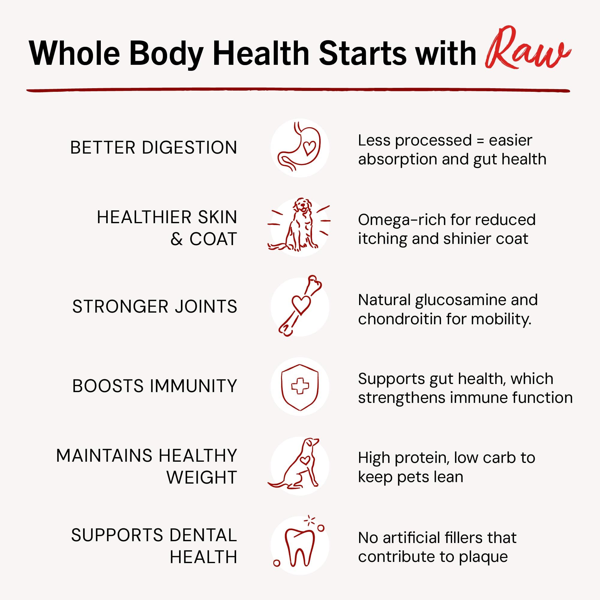 - תזונה גולמית פרימיום בקלות - כל קציצה מכילה 95% עוף חופשי עם איברים ועצמות כדי לספק תזונה עשירה בחומרים מזינים ועשירה בחלבון בצורה נוחה ומיובשת בהקפאה שאינה דורשת קירור או הכנה.