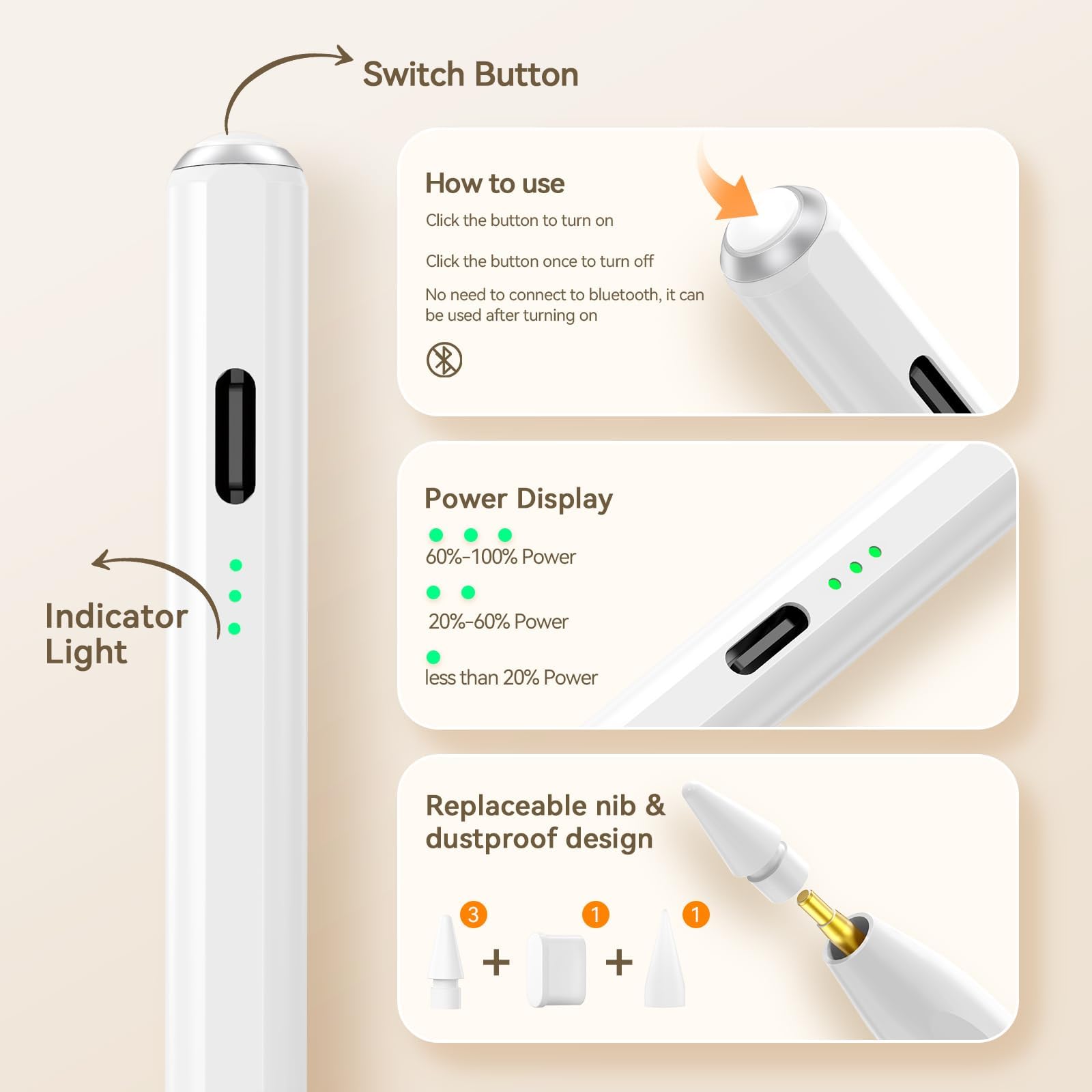 עט סטיילוס לאייפד (2018-2025) - טעינה מהירה של 13 דקות עם רגישות הטיה ודחיית כף יד לאייפד 11/10/9/8/7/דור שישי, Air 7/6/5/4/3/M3/M2, Pro 13"/12.9"/11"/M4, Mini 7/6/5, לבן