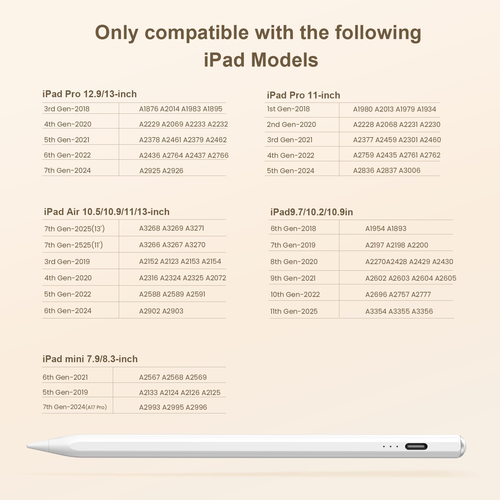 - 🖊【תאימות רחבה】: עט סטיילוס תומך באייפד 2018-2025: אייפד 11 11 אינץ' 2025/10/9/8/7/דור שישי, אייפד אייר 7 11 אינץ' (M3) 2025/דור שישי 13 אינץ' (M3) 2025/6/5/4/דור שלישי, אייפד פרו 13 אינץ' M4, אייפד פרו 12.9 אינץ' 3/4/5/דור שישי, אייפד פרו 11 אינץ' 1/2/3/4/M4, אייפד מיני 7 (A17 Pro)/6/דור חמישי. הערה: העיפרון אינו תואם לדגמי אייפד לפני 2018, אייפון, אנדרואיד ומכשירי מיקרוסופט. אנא בדוק את דגם המוצר שלך לפני ביצוע הזמנה.