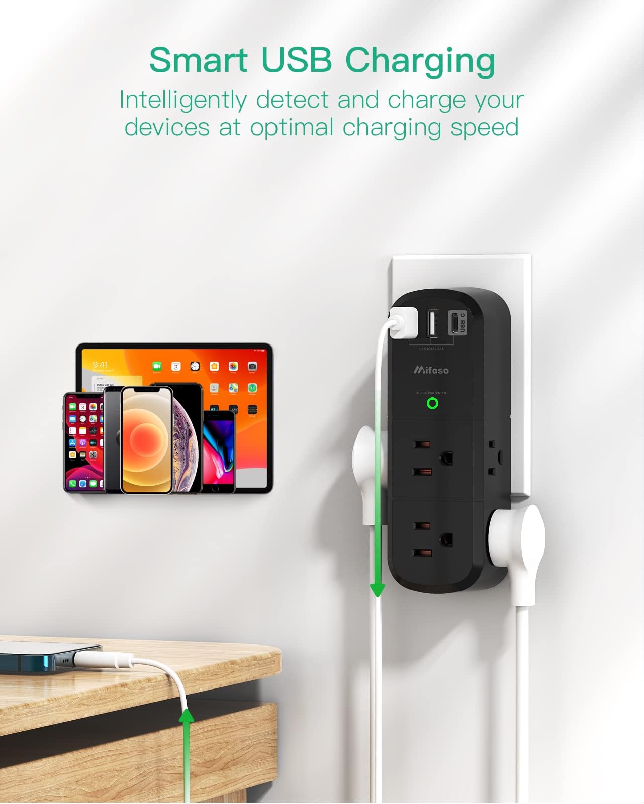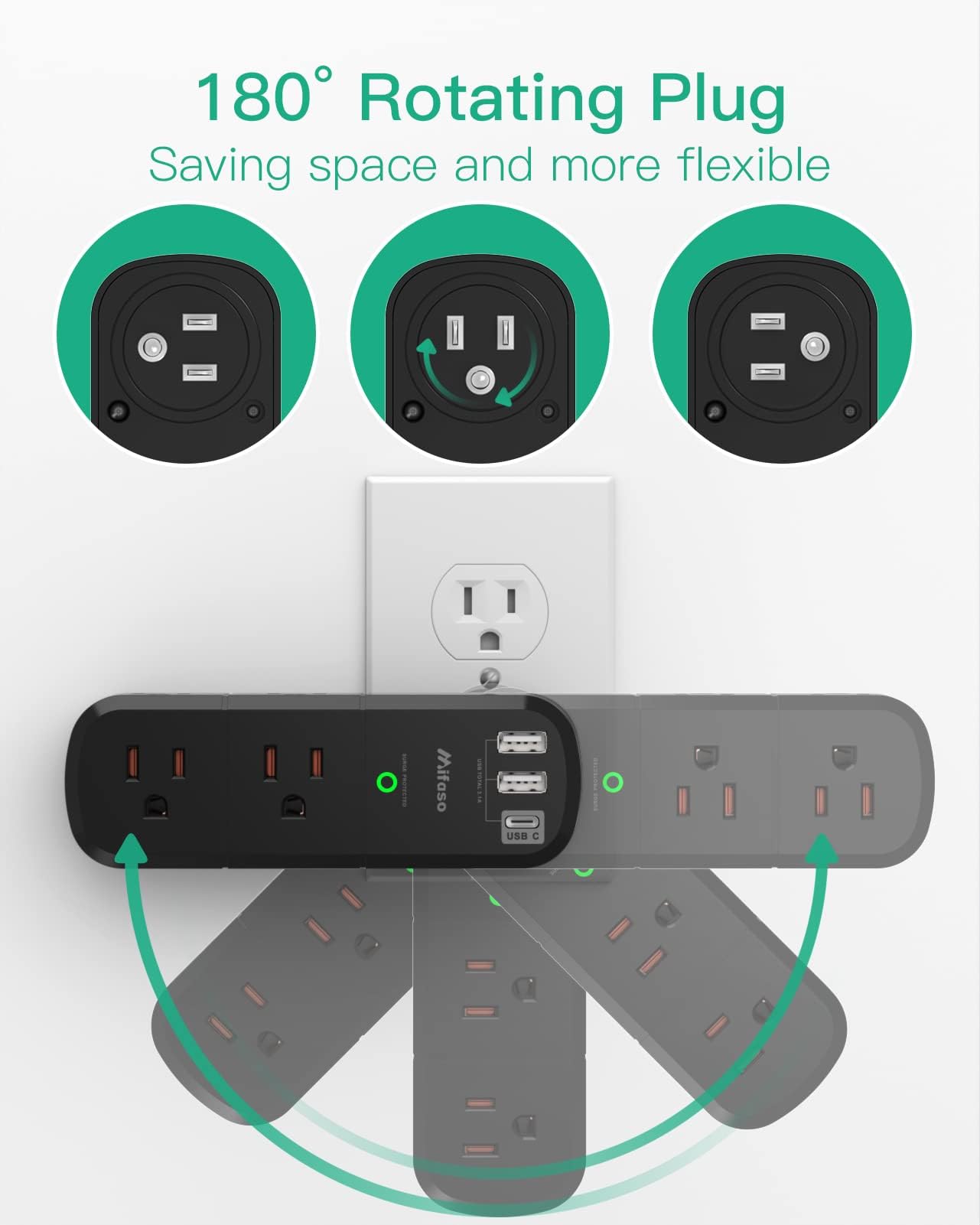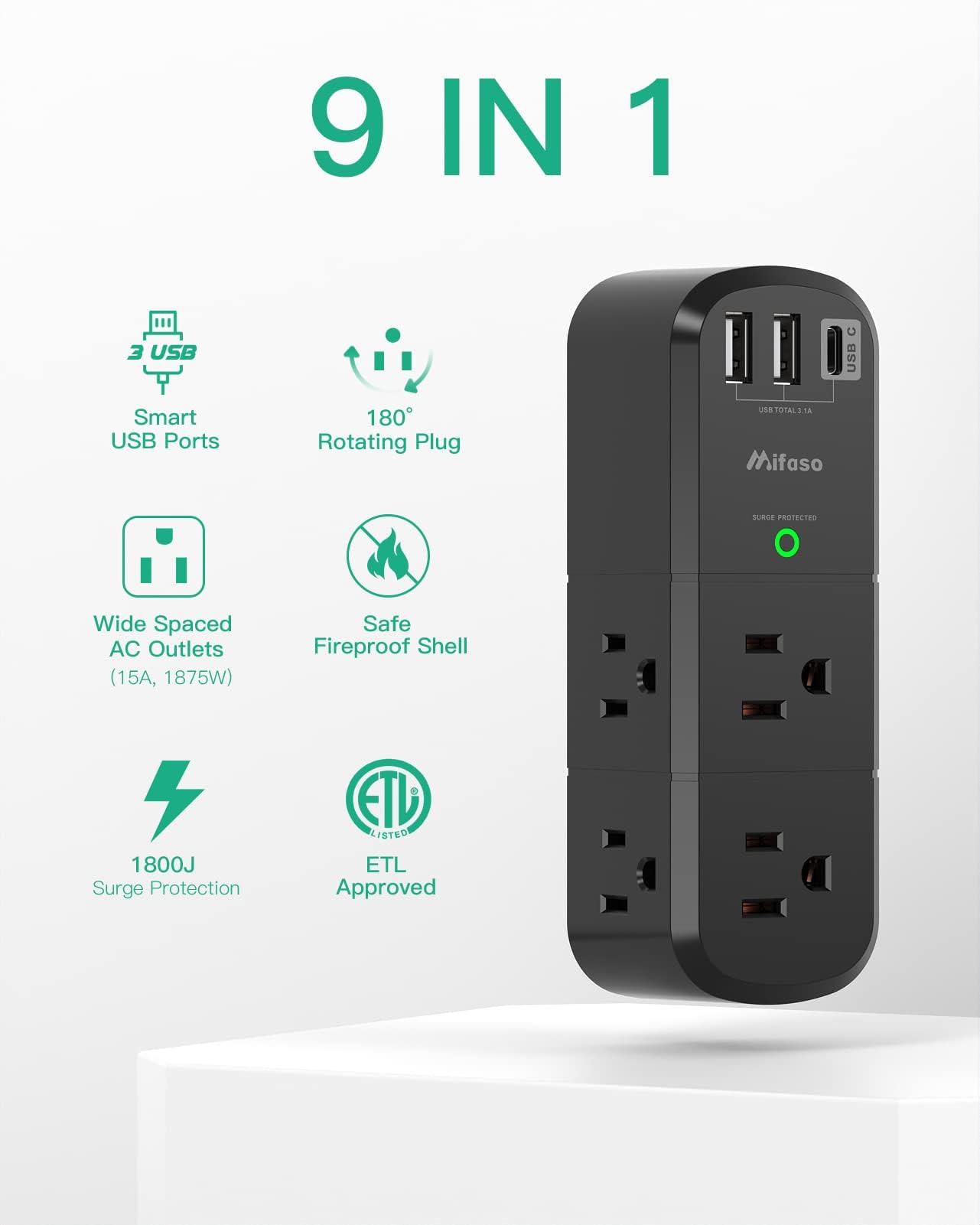 - 【שקע קיר USB 9 בפונקציה אחת】- מפצל 6 שקעי AC (3 צדדים, 15A/125V/1875W) עם מגן מתח מובנה של 1800 ג'אול ו-3 יציאות טעינה USB (1 USB C, תפוקה כוללת DC 5V/3.1A), תקע AC מסתובב 180 מעלות. נורית חיווי מוארקת המבטיחה שהמכשירים שלך מאובטחים.