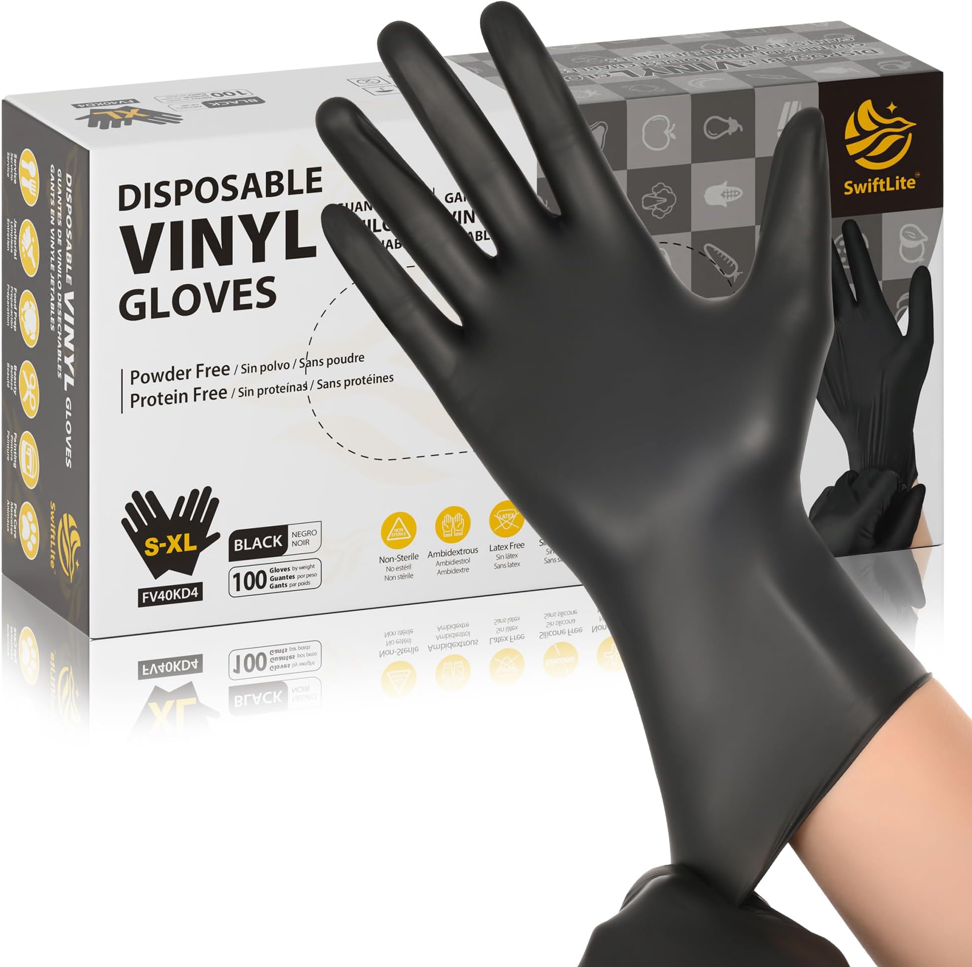 כפפות ויניל שחורות של SWIFTLITE, כפפות בדרגת מזון חד פעמיות ללא לטקס וללא אבקה, כפפות לניקוי, בישול והכנת אוכל (100, גדולות)