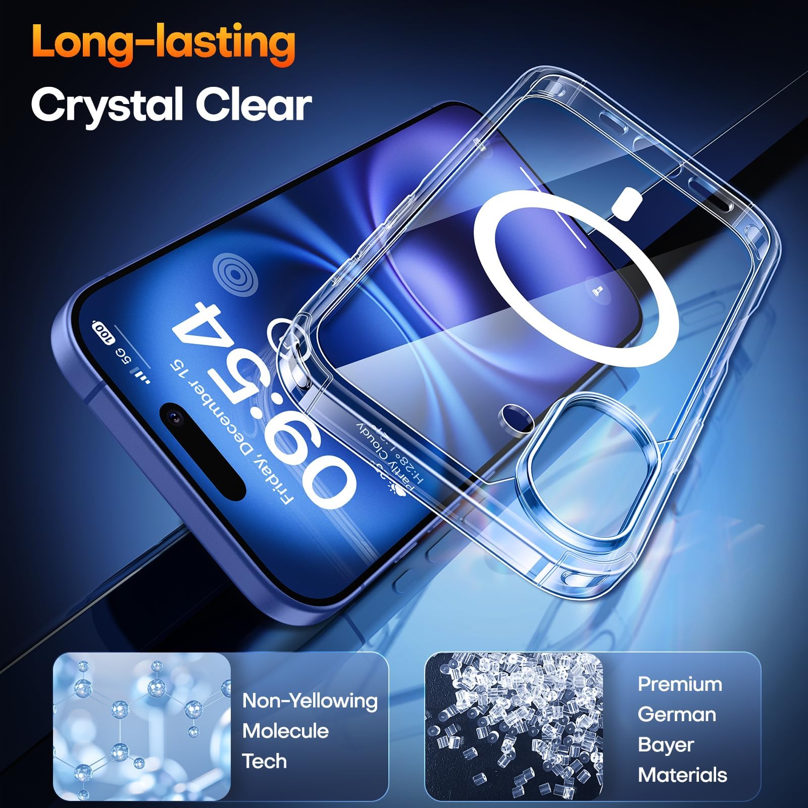כיסוי TAURI לאייפון 16, תואם ל-MagSafe, עם מגני מסך, הגנה נגד הצהבה ברמה צבאית, כיסוי טלפון מגנטי דק ועמיד בפני זעזועים לאייפון 16 6.1 אינץ' שקוף