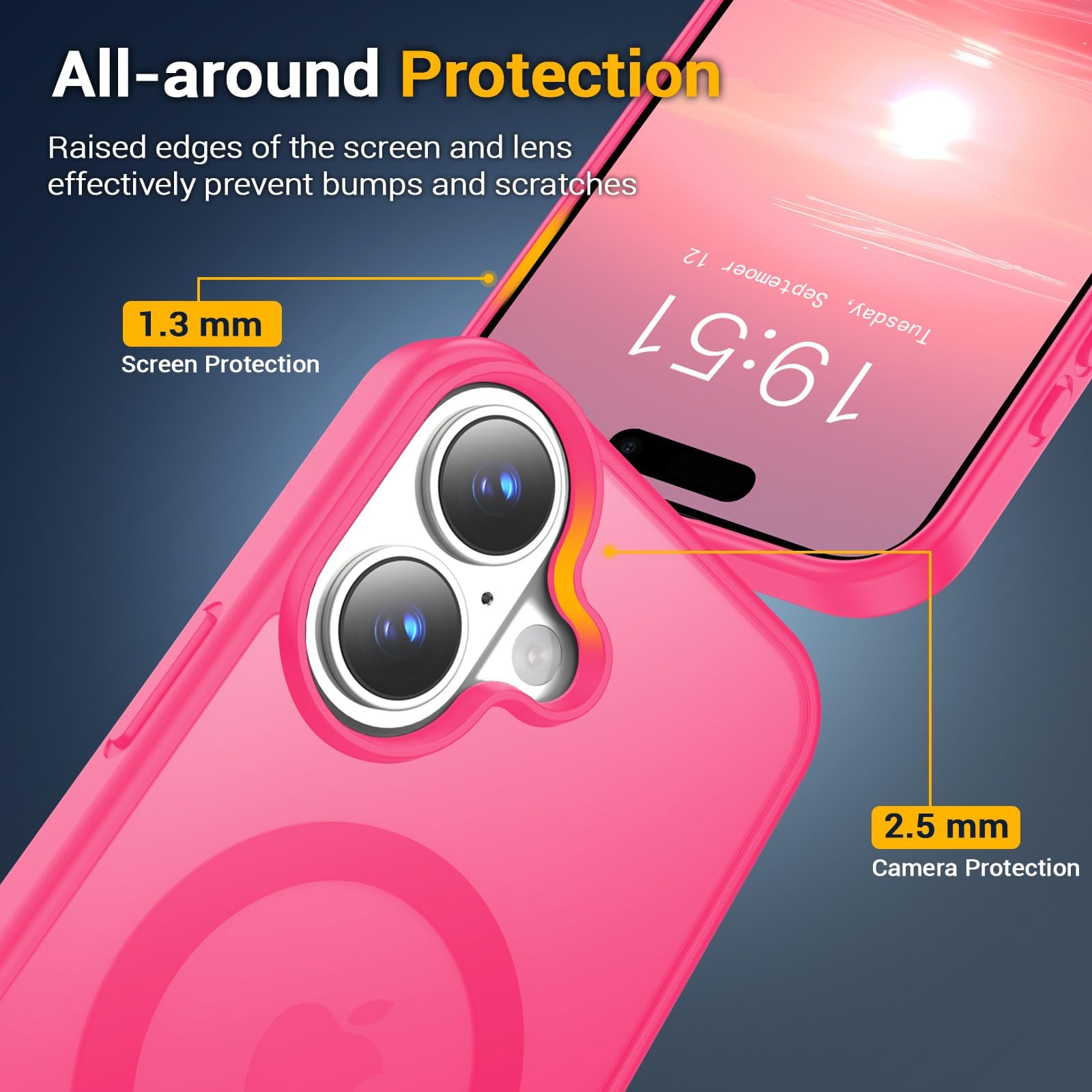 - הגנה יעילה במיוחד: מסגרת המסך בעובי 1.0 מ"מ ומסגרת המצלמה בעובי 2.0 מ"מ מספקים הגנה יעילה למסך ולמצלמה. כיסוי הטלפון כולל פינות בולמות זעזועים המפזרות ביעילות פגיעות.