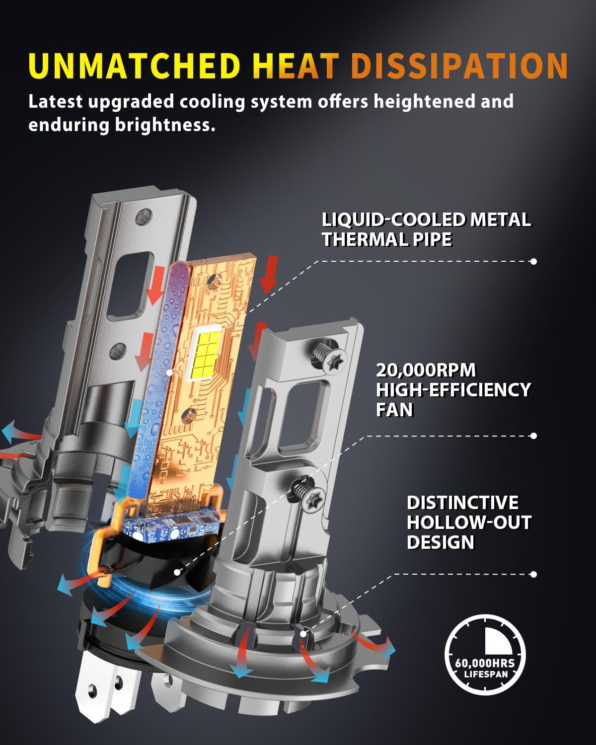 - אורך חיים של מעל 70,000 שעות: נורות H7 אלו, הבנויות מחומרים איכותיים, כולל אלומיניום ברמת תעופה ולוח בסיס נחושת משמעותי, מספקות מעל 70,000 שעות של תאורה עקבית ויציבה. מאוורר קירור במהירות גבוהה מפזר ביעילות חום, ומפחית את הצורך בהחלפות תכופות.