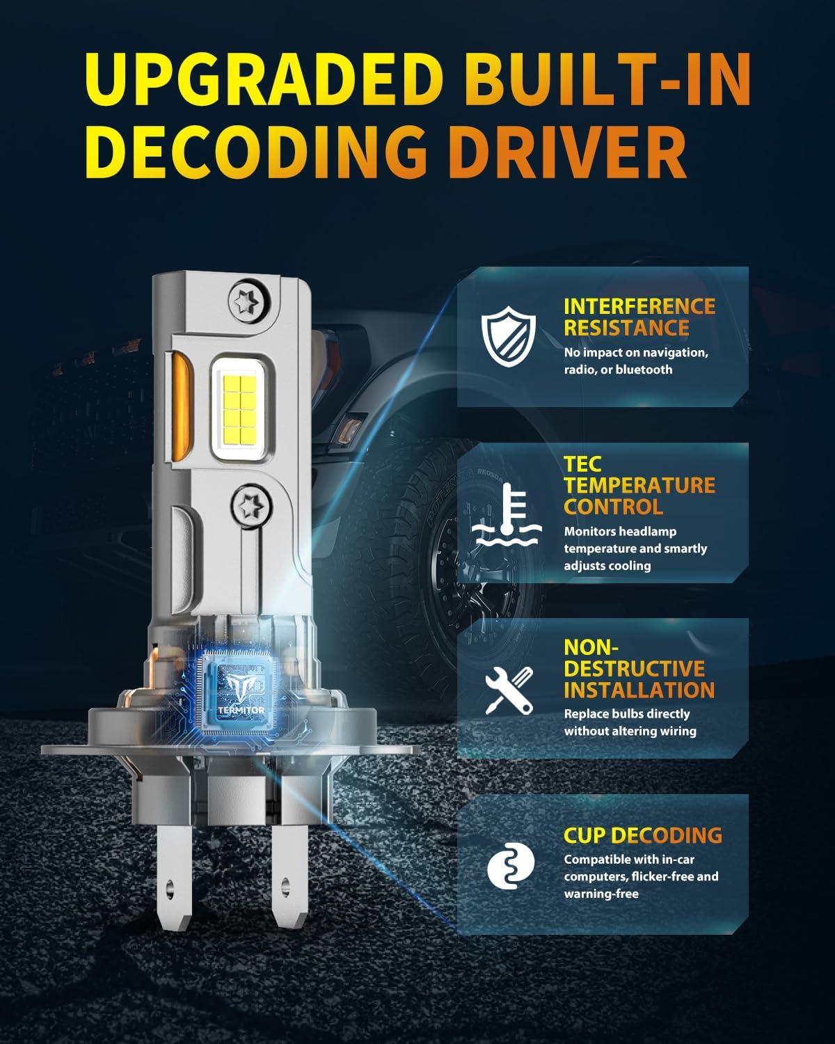 נורות H7/H7LL חדישות של Termitor, 40,000 לומן, בהירות 900%, לבן 6500K בהיר במיוחד, גודל הלוגן 1:1, פנסי ערפל H7 לבן קר 6500, ללא צורך במתאם, התקנה קלה, ללא קוטביות, חבילה של 2