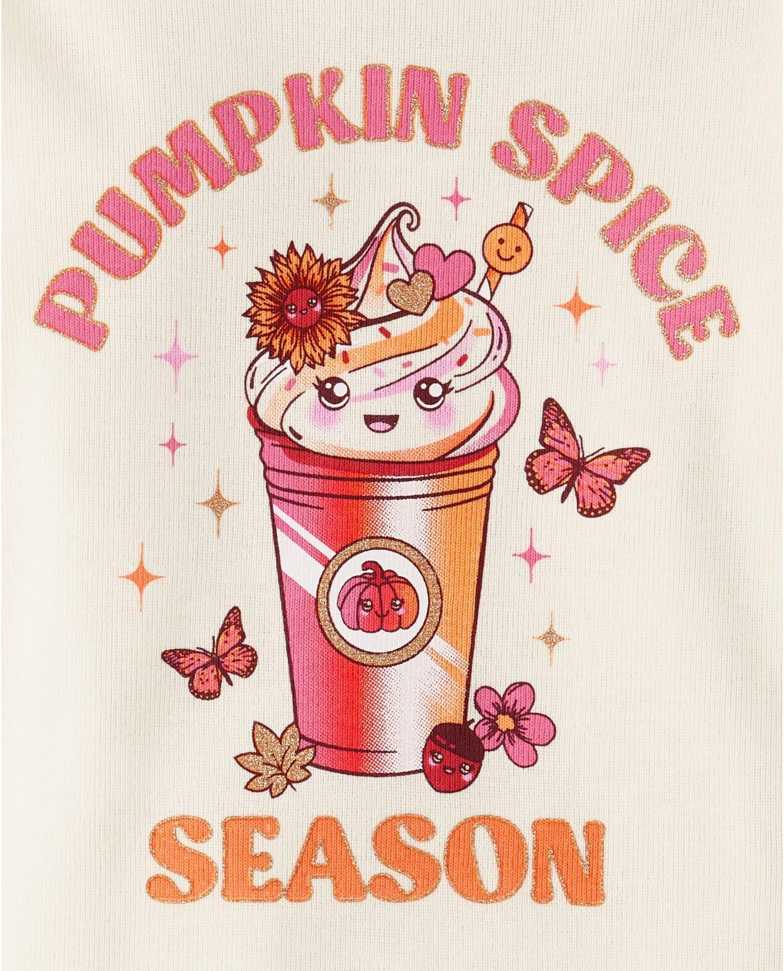 - טופ פיג'מה: צווארון עגול סריג צלעות, שרוולים ארוכים עם חפתים סריג צלעות, גרפיקה של 'pumpkin spice'