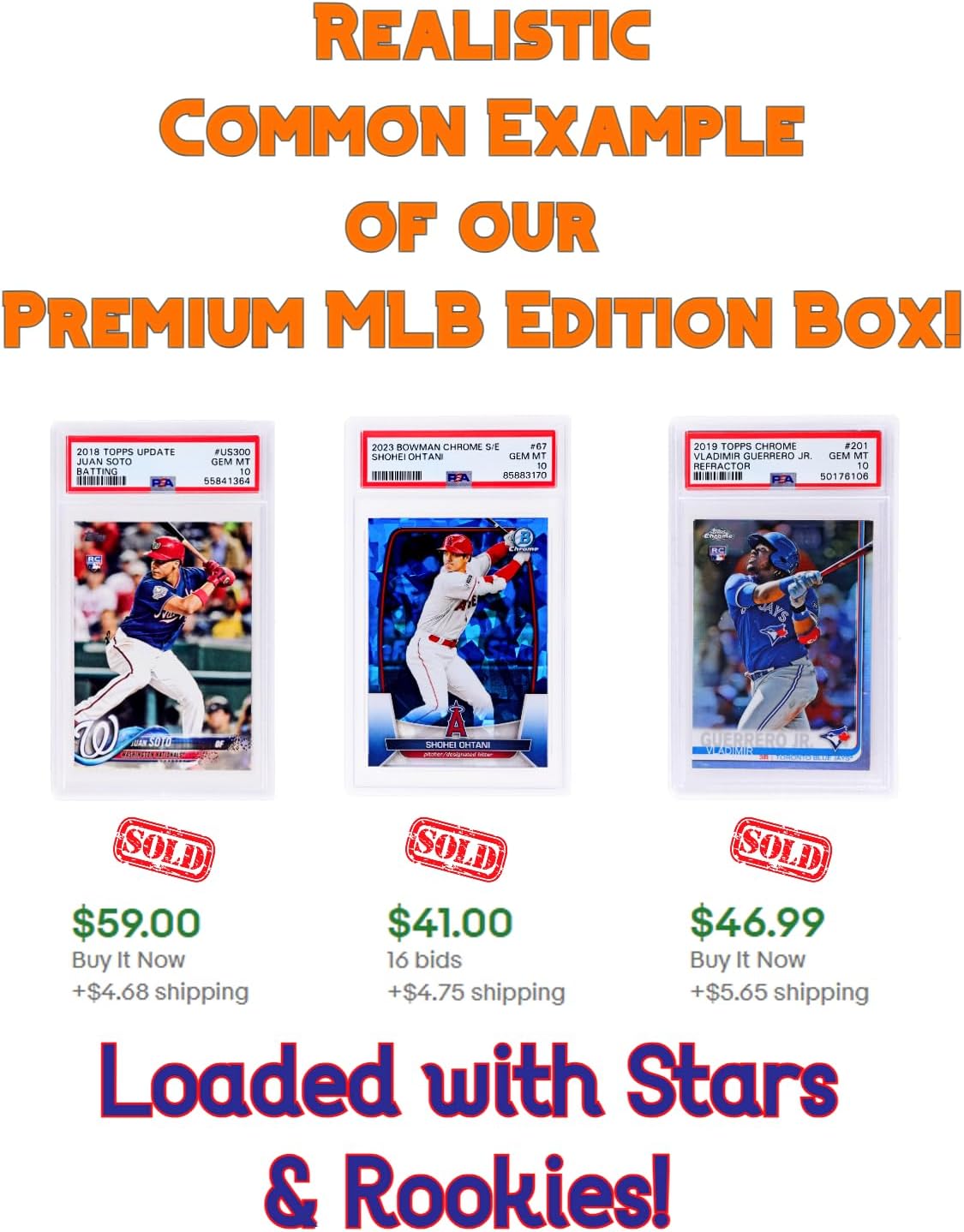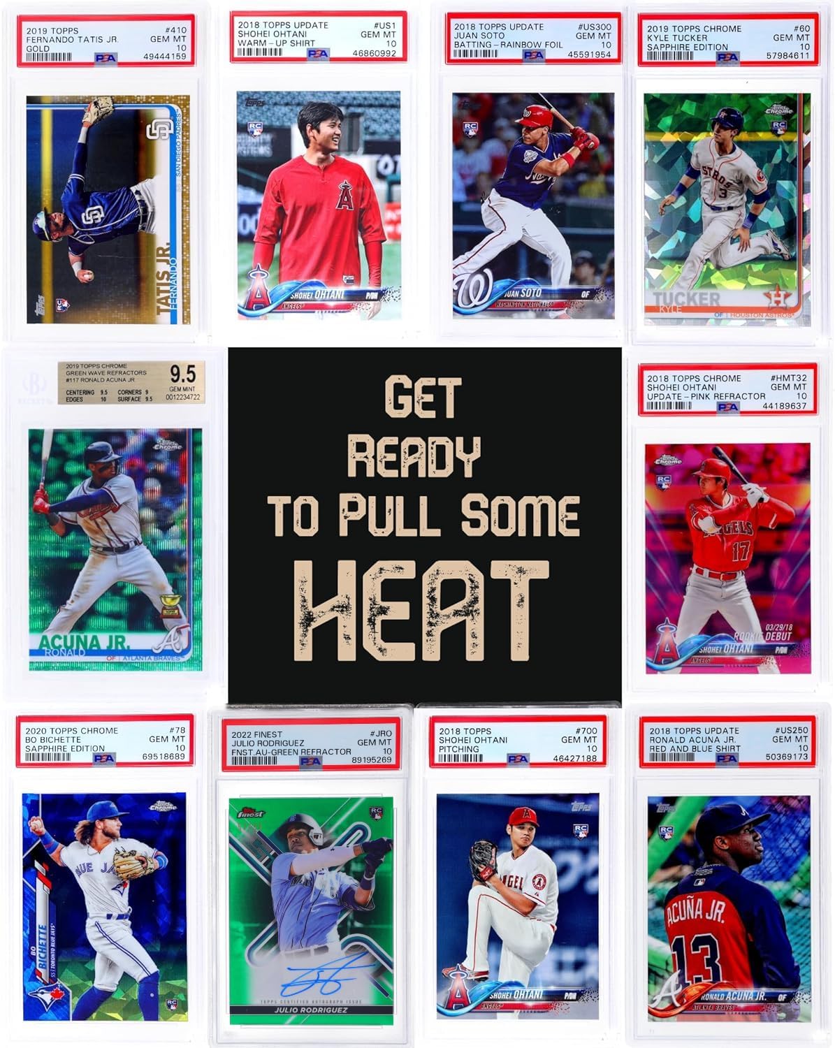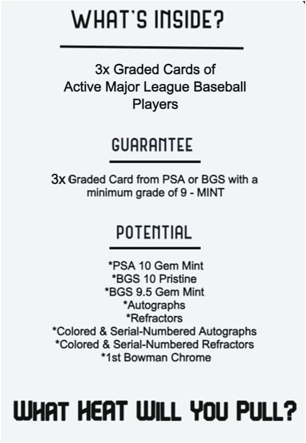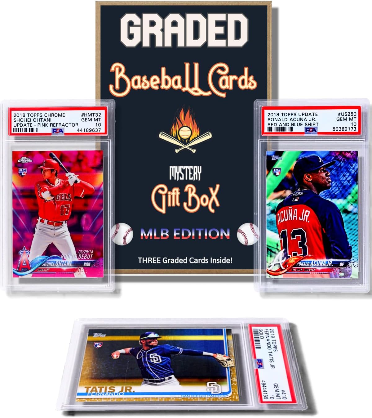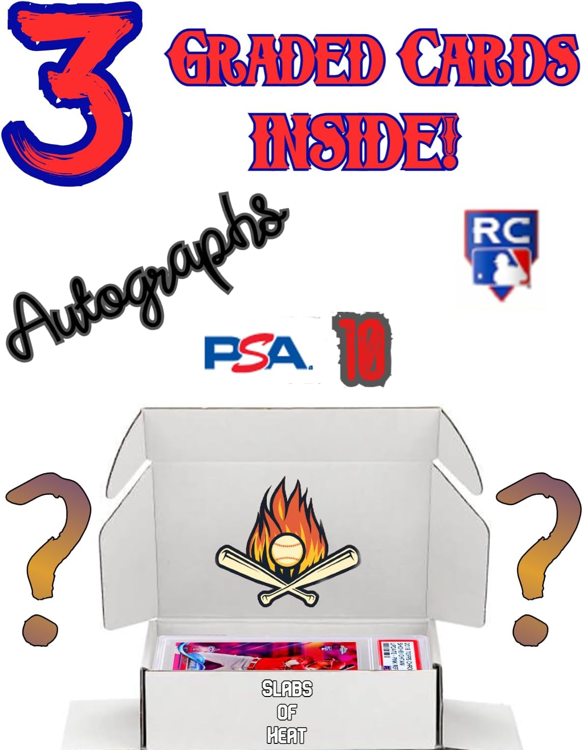 קופסת מתנה של שלושה קלפי בייסבול מדורגים: מהדורת MLB │שלושה קלפי PSA/BGS פרימיום מדורגים 10, 9.5 או 9 │חתימות פוטנציאליות למתחילים ומשקפי RC ממוספרים │מתנה לאוהדי בייסבול │מאת Slabs of Heat
