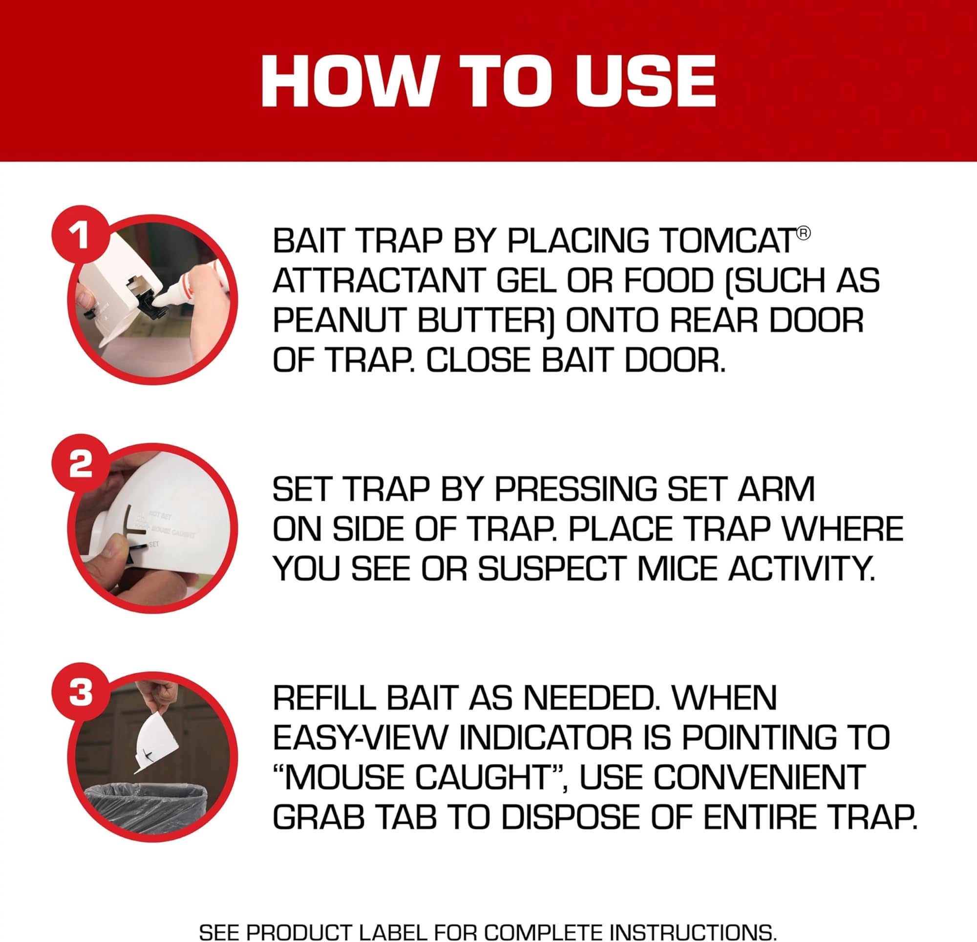 הגנה על הבית והמשפחה שלכם מפני עכברים הפכה לקלה יותר עם מלכודת העכברים Tomcat® Kill & Contain®. העיצוב המכוסה של מלכודת עכברים זו הורג ומכיל את העכבר, כך שלעולם לא תצטרכו לראות או לגעת בעכבר מת שוב. קראתם נכון - אתם לא צריכים לראות את העכבר כדי לדעת שהוא נתפס. בנוסף, המלכודת נהדרת לחללים צרים ומוצבת בנגיעה אחת בלבד. לשימוש, פתחו את דלת הפיתיון הממוקמת בגב המלכודת והניחו ג'ל משיכה Tomcat® (נמכר בנפרד) או מזון אחר כמו חמאת בוטנים או גבינה בתוך תא הפיתיון. לאחר מכן, סגרו את דלת הפיתיון והצבתו את המלכודת על ידי לחיצה על הזרוע בצד המלכודת. אנו ממליצים להציב שתי מלכודות עכברים Kill & Contain® במרחק של 1.5 עד 3 מטרים זו מזו באזורים שבהם נצפתה פעילות עכברים או נחשדה, כמו ליד מקררים, תנורים ומזווה, בין מכונות כביסה ומייבשים, ולאורך פנלים. בדקו את המלכודות לעתים קרובות. כאשר המחוון מצביע על "עכבר נתפס", העכבר נתפס. פשוט השתמשו בלשונית האחיזה כדי להיפטר מהמלכודת כולה. חבילה זו של מלכודת עכברים Tomcat® Kill & Contain® מכילה 2 מלכודות עכברים חד פעמיות.
