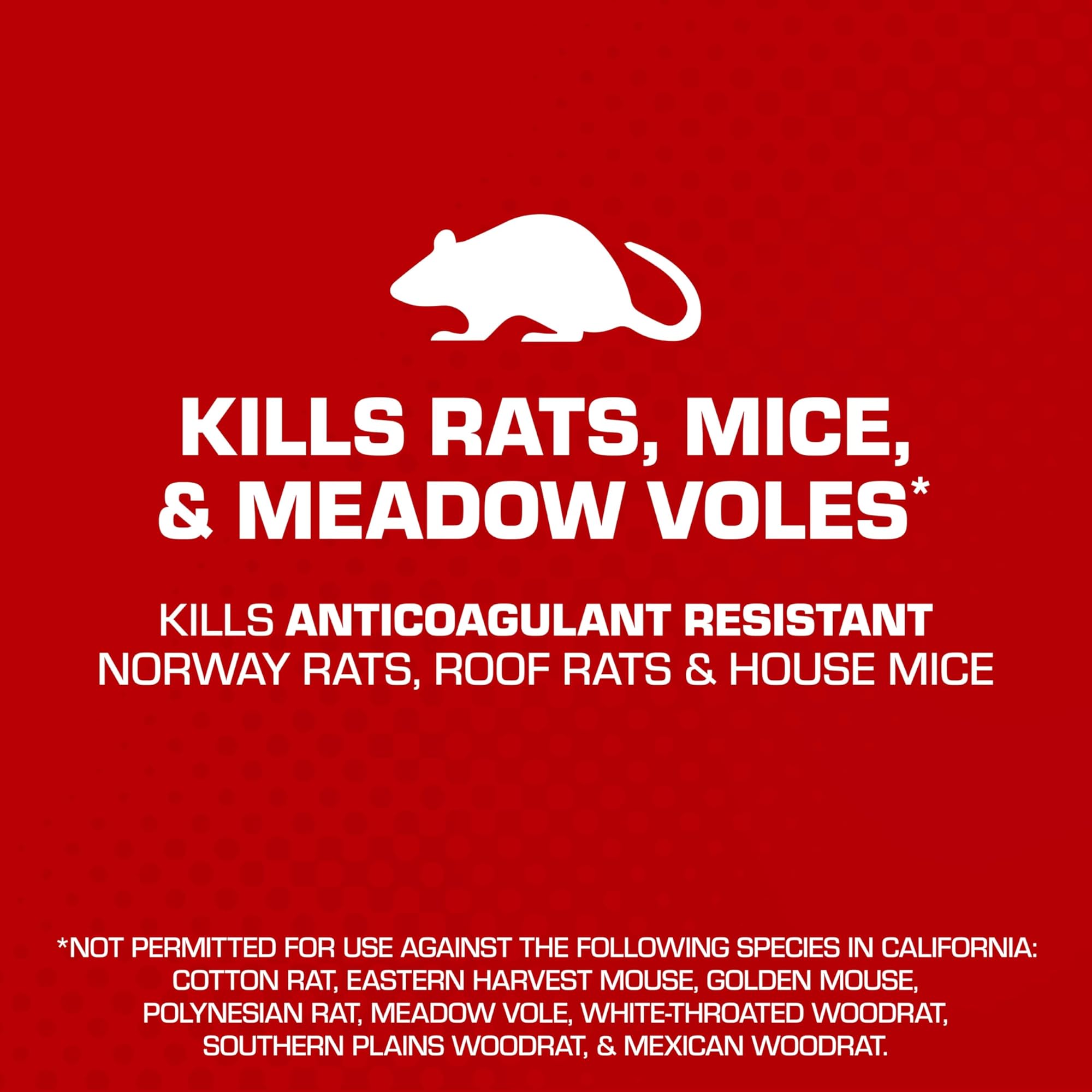 - חולדות נורבגיות, חולדות גג ועכברי בית מפסיקות לאכול לאחר צריכת מנה רעילה; כל בלוק הורג עד 12 עכברים (בהתבסס על בדיקות מעבדה ללא ברירה).