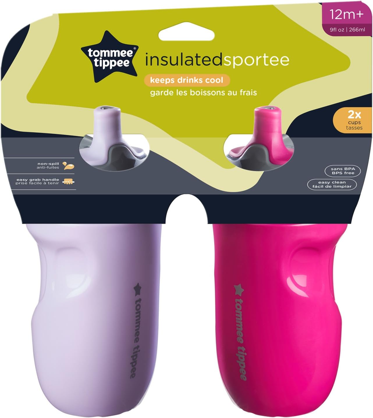 בקבוק מים מבודד לפעוטות Tommee Tippee 235 מ"ל עם פיה ספורטיבית, ללא נזילות, כוסות סתימה לפעוטות 1-3, שסתום דו-חלקי המסייע במניעת נזילות, לילך ושזיף, ללא BPA, חבילה של 2
