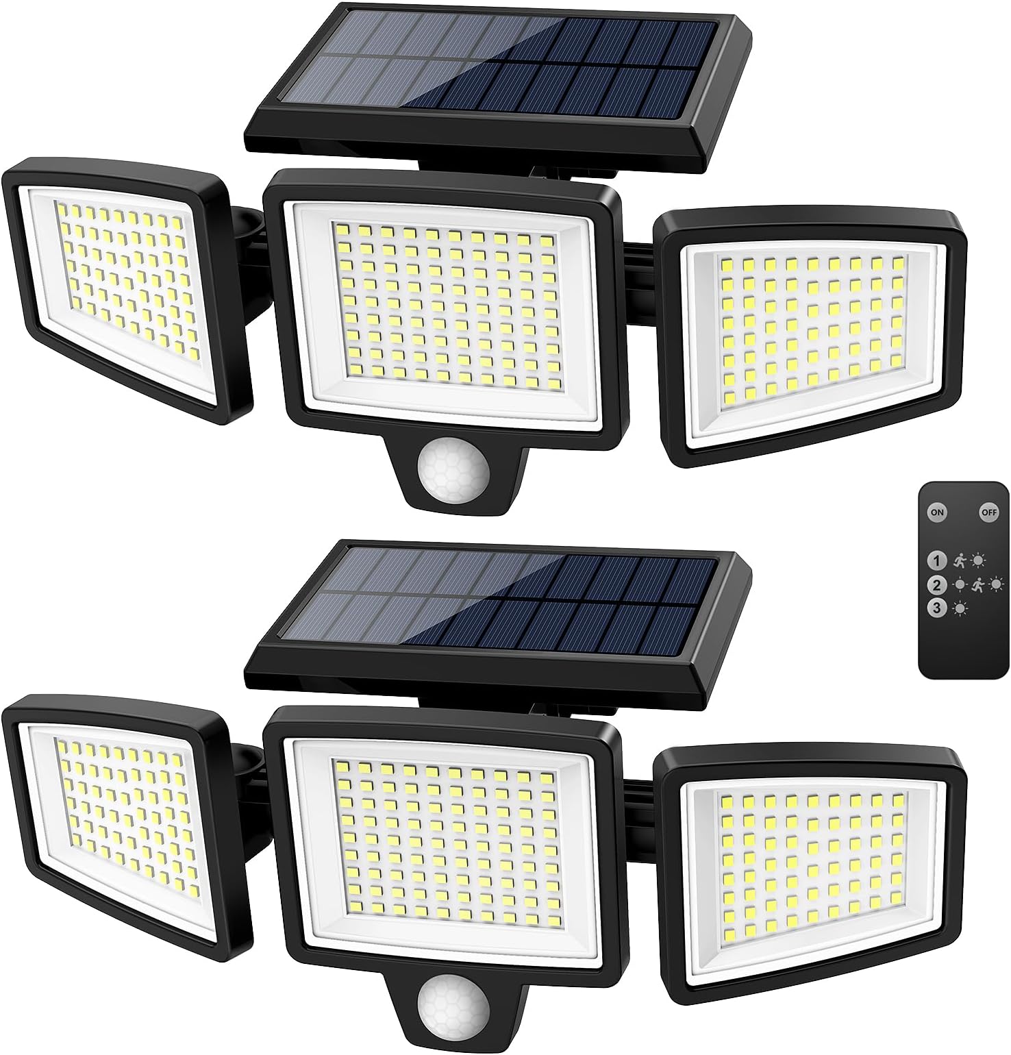 תאורת חוץ סולארית Tuffenough 2500 לומן 210 נורות LED עם שלט רחוק, 3 ראשי תאורת חיישן תנועה, עמידות למים IP65, תאורת קיר מבול רחבה 270° עם 3 מצבים (2 חבילות)