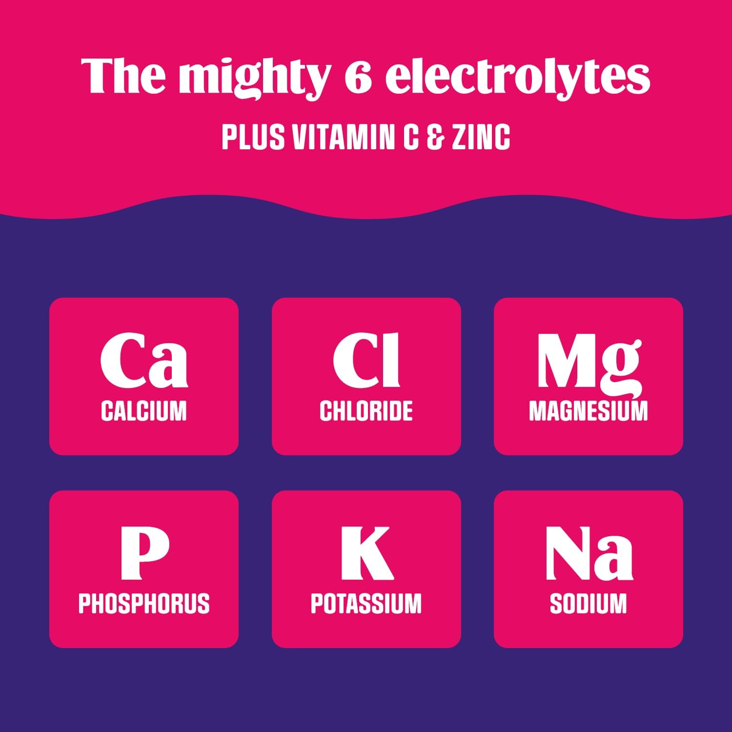 - טעים באופן טבעי: תערובת משקה אלקטרוליטים עשויה מ-6 אלקטרוליטים עיקריים - מגנזיום, סידן, אשלגן, כלוריד, זרחן ונתרן, כמו גם ויטמין C ואבץ; ממותק באופן טבעי עם עלי סטיביה אורגניים ומועשר בטעמי פירות אמיתיים.