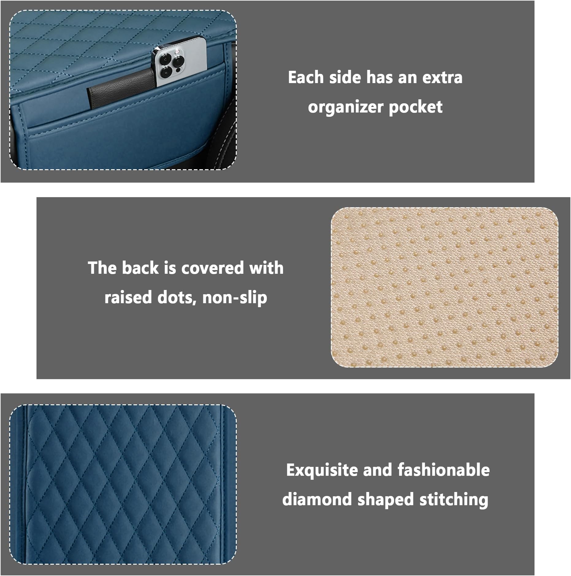 - 🔰 עיצוב אחסון צדדי משודרג - מידות המוצר שלנו הן: 12.13 x 7.8 אינץ', אנא ודאו שאתם מודדים את תיבת משענת היד שלכם כדי לראות אם היא מתאימה לפני הרכישה. ישנו עיצוב כיס אחסון בגודל 8.66*5.12 אינץ' בכל צד שמאל וימין, מה שמרחיב את שטח האחסון, נוח ומעשי. עונה על צרכי האחסון של מושב הנוסע הראשי, תוכלו לאחסן את הטלפון הנייד, המפתחות, טישו, תעודת זהות וכמה פריטים קטנים יומיומיים אחרים.