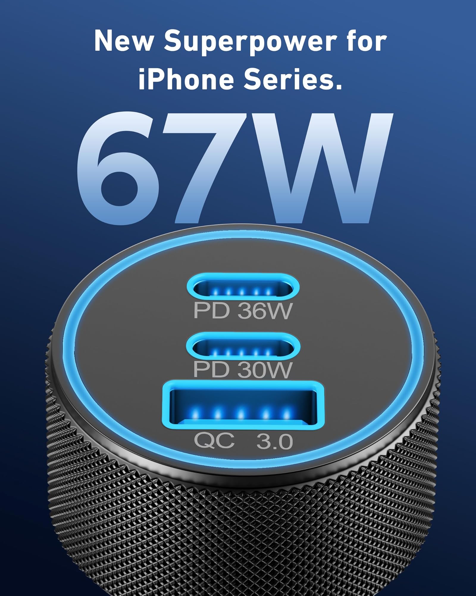 מטען לרכב USB C, 3 יציאות 67W כפול USBC ו-USB-A אביזרי טלפון לרכב מתאם מתח מהיר מטען לרכב PD/QC מצית סיגריות לאייפון 17/16/15, אייפד, סמסונג גלקסי S25/S24, אנדרואיד, חבילה של 2
