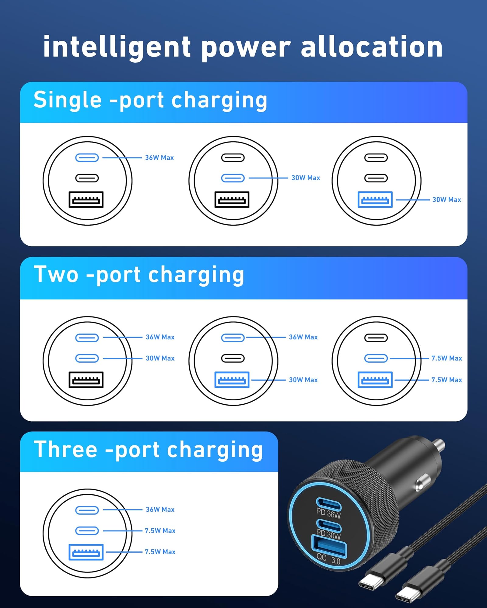 - תאימות רחבה: מטען טלפון לרכב עם שני יציאות USB-C ויציאת USB-A אחת, יכול לטעון כמעט את כל התקני ה-USB, תואם לאייפון אייר, אייפון 17 פרו מקס/17 פרו/17, אייפון 16/16e/15/14/13/12, XS/XR/X/8/7/6, אייפד, סמסונג גלקסי S25/S24/S23/S22/S21, נוט 20/10/9, גוגל פיקסל 8/7/6/5, AirPods, שעונים חכמים, מקליט נהיגה, ניווט GPS, שואב אבק לרכב, סוללות ניידות ומכשירים אחרים.