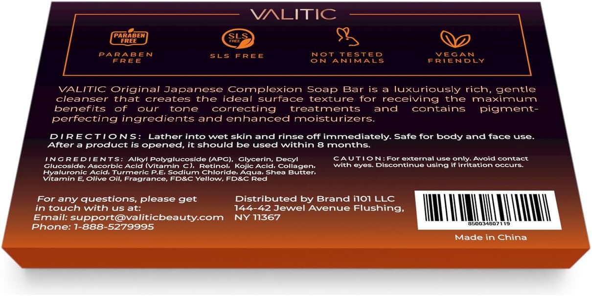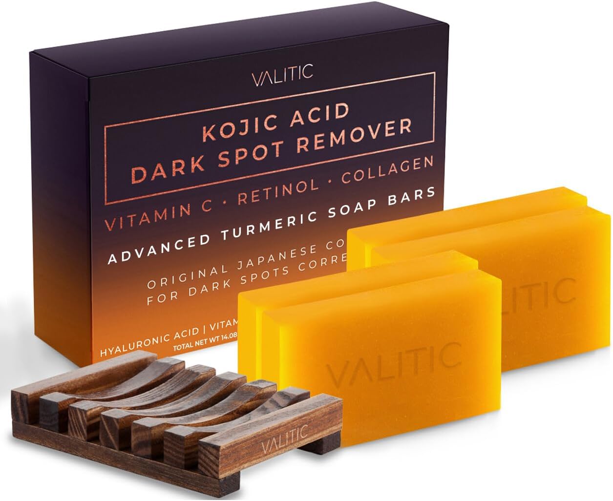 סבון Valitic להסרת כתמים כהים עם חומצה קוג'ית, ויטמין C, רטינול, קולגן, כורכום - קומפלקס יפני מקורי - חומצה היאלורונית, ויטמין E, חמאת שיאה, שמן קסטיליה (חבילה של 4) עם מחזיק סבון
