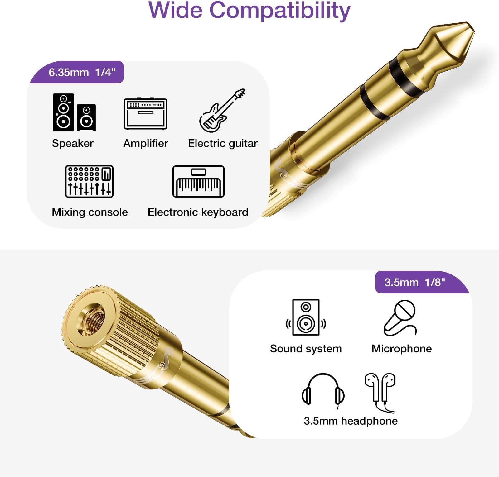 - מתאמי שקע שמע בגודל 1/4 אינץ' ל-3.5 מ"מ מאפשרים יציאת סטריאו 6.35 מ"מ לחיבור כבל AUX של תקע 3.5 מ"מ