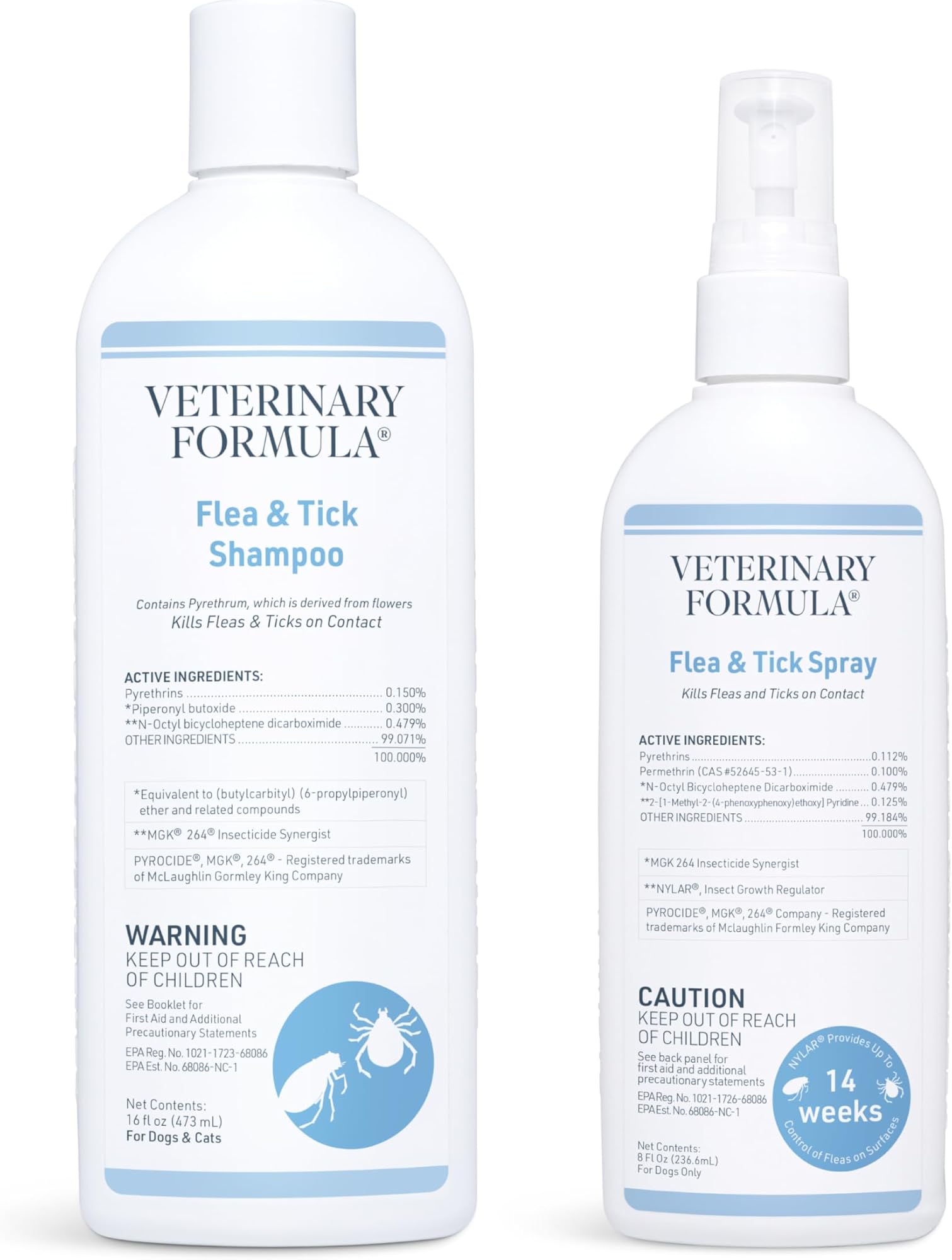 הגן על חיית המחמד שלך מפני פרעושים וקרציות בעזרת חבילת השמפו והספריי נגד פרעושים וקרציות של Veterinary Formula, צמד עוצמתי שנועד להרוג מזיקים במגע ולספק מניעת פרעושים וקרציות לאורך זמן לכלבים. חבילה זו משלבת שמפו וטרינרי לפרעושים וקרציות המנקה, מרגיע ומקלף את עור חיית המחמד שלך עם תרסיס פרעושים יעיל לכלבים, אשר מסלק פרעושים וקרציות בכל שלבי החיים ומונע הדבקה חוזרת עד 14 שבועות. שמפו הפרעושים והקרציות לכלבים וחתולים מנוסח עם פירתרום, קוטל חרקים טבעי שמקורו בפרחים, כדי לספק הקלה מיידית תוך ניקוי עדין והרגעת עור מגורה בעזרת אלוורה ולנולין. הוא ללא סבון וללא פרבנים, מה שהופך אותו לבטוח לכלבים, חתולים, חמוסים וסוסים מגיל 12 שבועות ומעלה. תרסיס הפרעושים לכלבים מכיל פירתרינים בוטניים, פרמתרין ונילר, הפועלים יחד להרוג פרעושים וקרציות במגע תוך מניעת התפתחות ביצי פרעושים וזחלים לבוגרים עד 14 שבועות. טיפול קל לשימוש זה נגד פרעושים וקרציות לכלבים מספק הקלה מהירה מלכלוך פרעושים, גירוד מוגזם, דלקת עור אלרגית ותסמינים אחרים הקשורים לפרעושים. ניתן למרוח את התרסיס מחדש לפי הצורך, אך לא יותר מפעם בשבועיים, להגנה מתמשכת. עם Veterinary Formula Clinical Care, תקבלו טיפול יעיל ופרעושים במחיר סביר, המומלץ על ידי וטרינר. חיית המחמד שלכם תהיה נקייה מפרעושים וקרציות, תריח רענן ותהיה לה פרווה בריאה ומבריקה, כך שתוכלו להתמקד במה שחשוב ביותר - חטיפים, זמן משחק וליטופים!