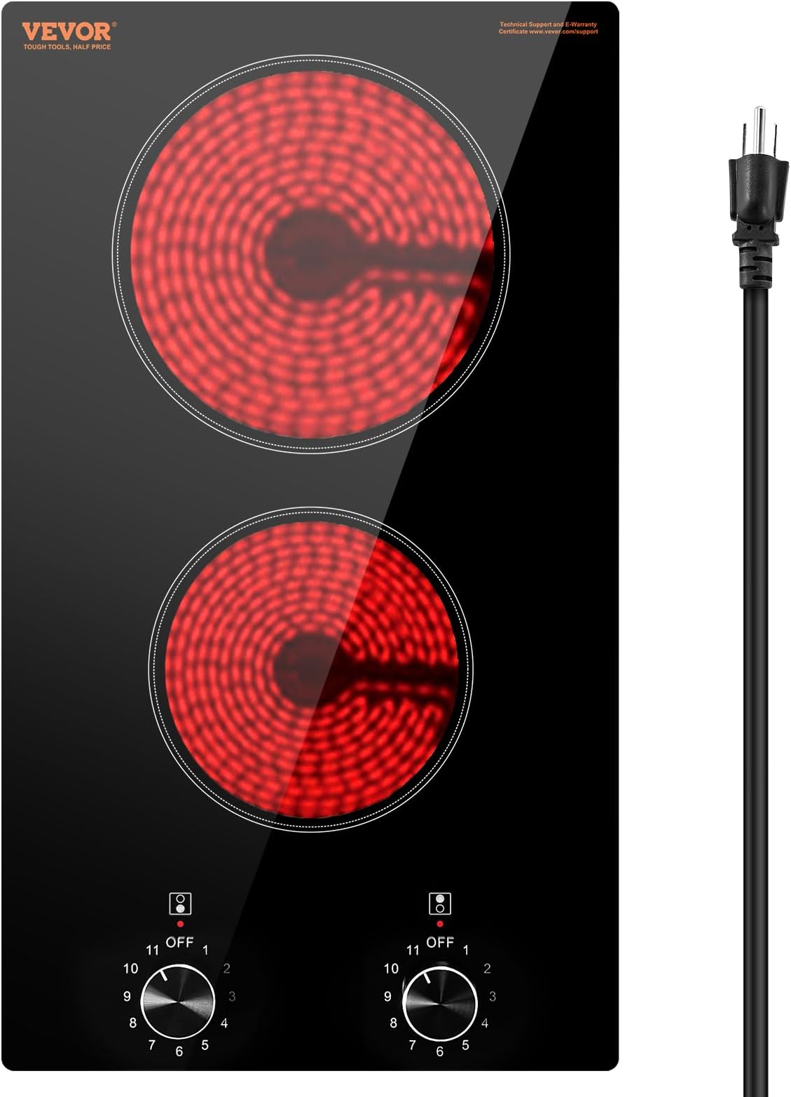 כיריים חשמליות VEVOR, כיריים חשמליות מובנות, עם לוח זכוכית, כפתורי שליטה, 11 דרגות חום, למגוון דרישות בישול (12 אינץ' - 2 להבות/110V)