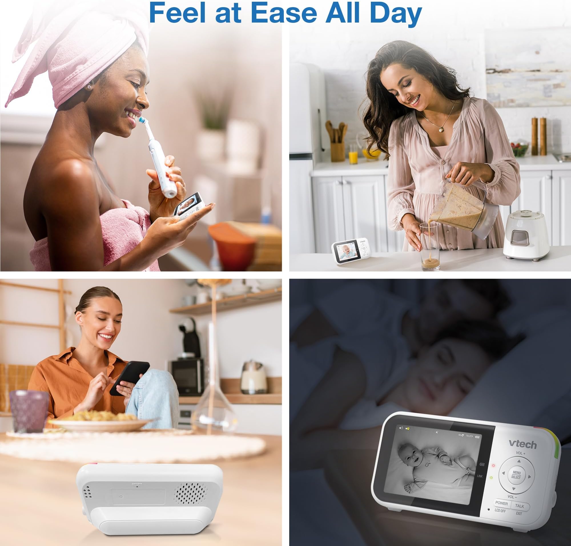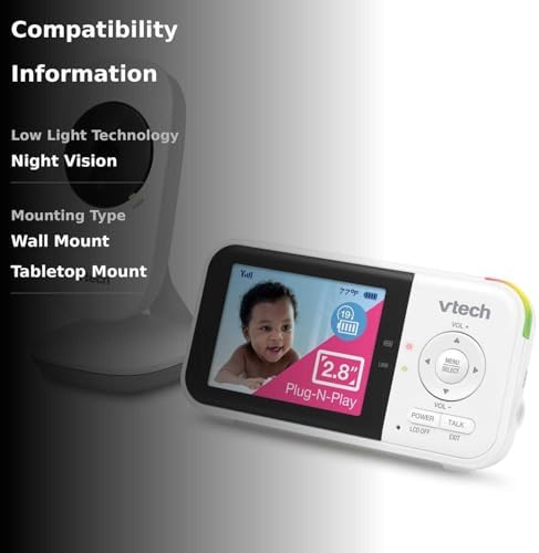 מוניטור תינוק VTech VM819 עם מצלמה ושמע, מצלמת תינוק ניידת עם מסך 2.8 אינץ', ראיית לילה, שמע דו-כיווני, חיישן טמפרטורה ושירי ערש, שידור מאובטח ללא WiFi, אידיאלי לתינוקות/קשישים/חיות מחמד