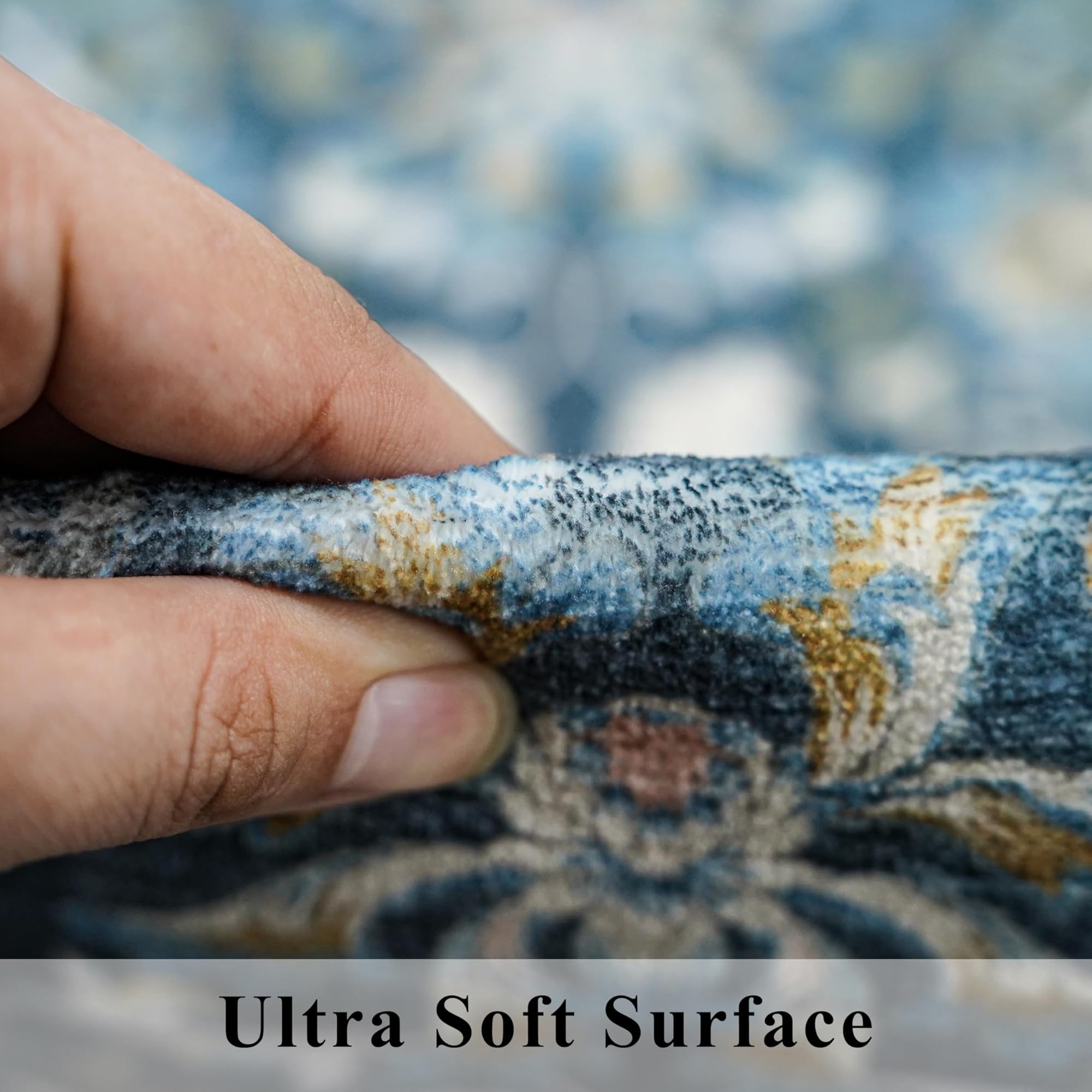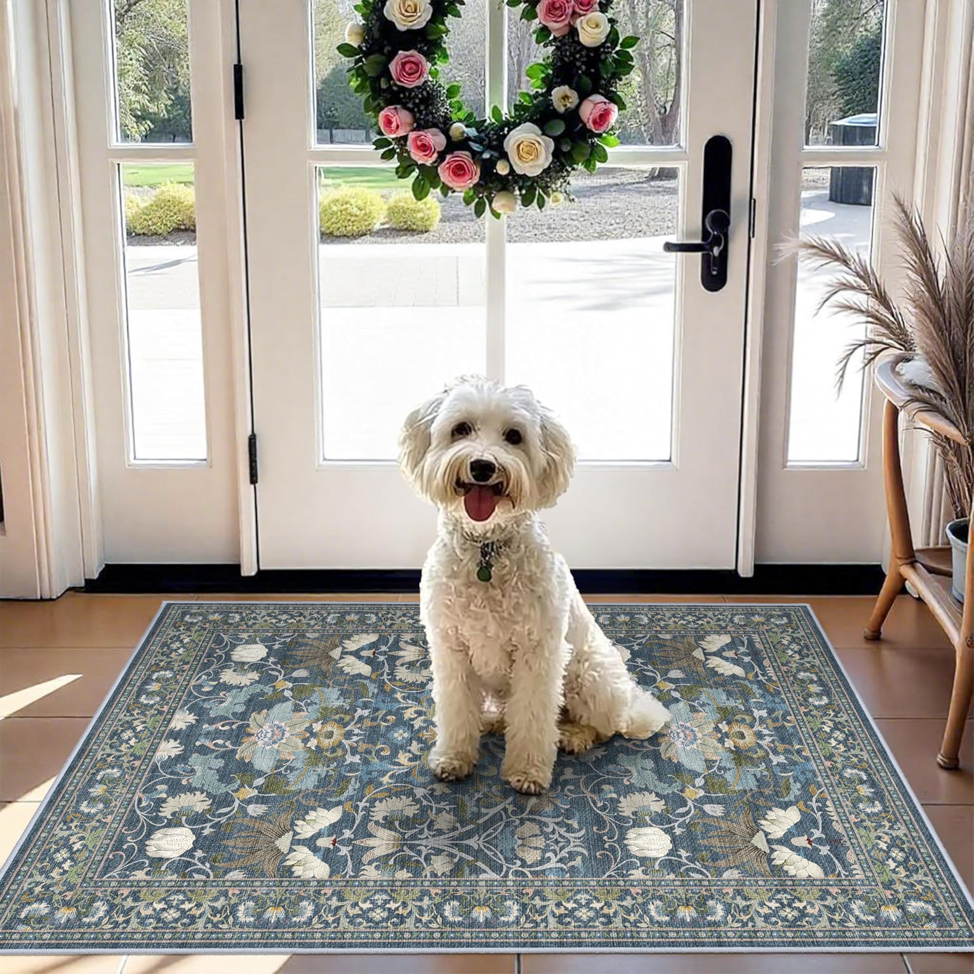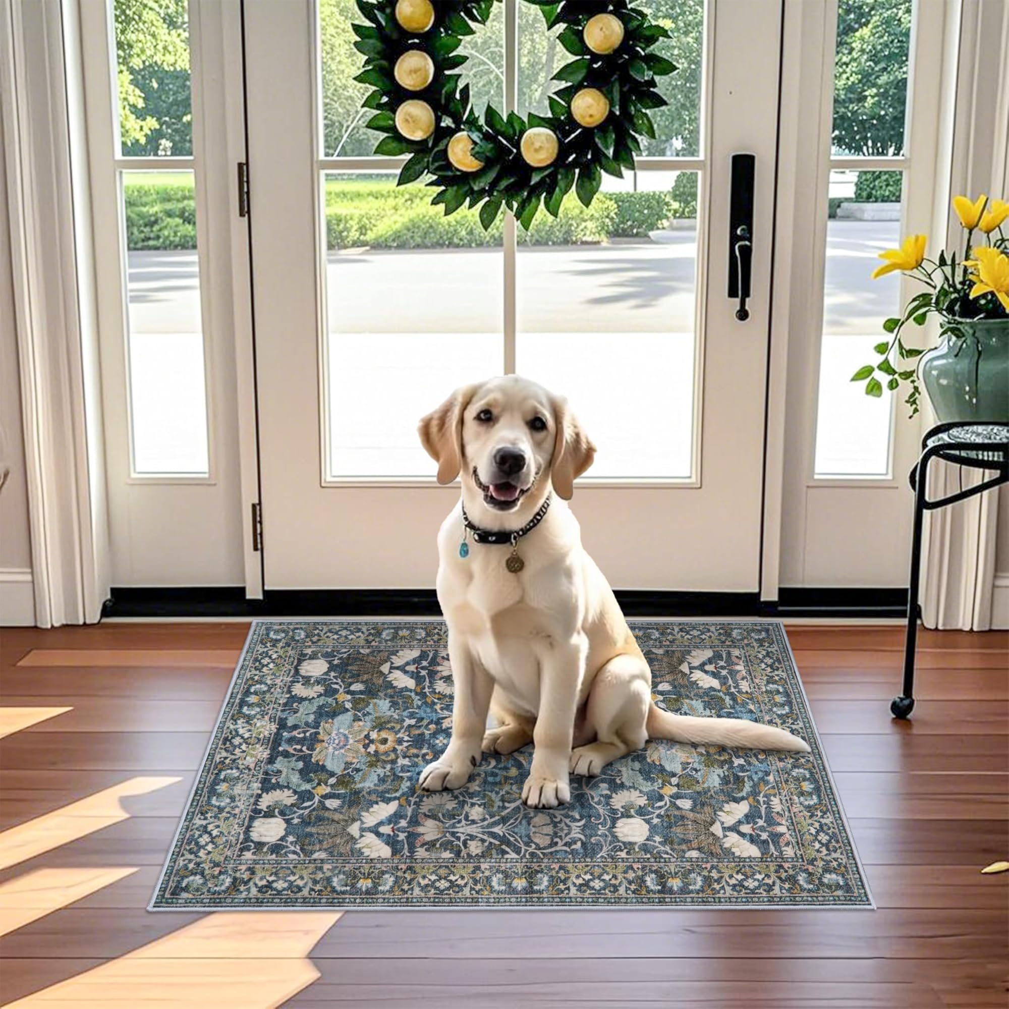 שטיח ראנר 2x3 ניתן לכביסה לכניסה: שטיח קל לניקוי עם גב מונע החלקה לחדר שינה ומטבח, שטיח רצפה עמיד בפני כתמים וללא נשירה - מושלם לאזורים עם תנועה רבה עם חיות מחמד (2x3, פרחוני/כחול)