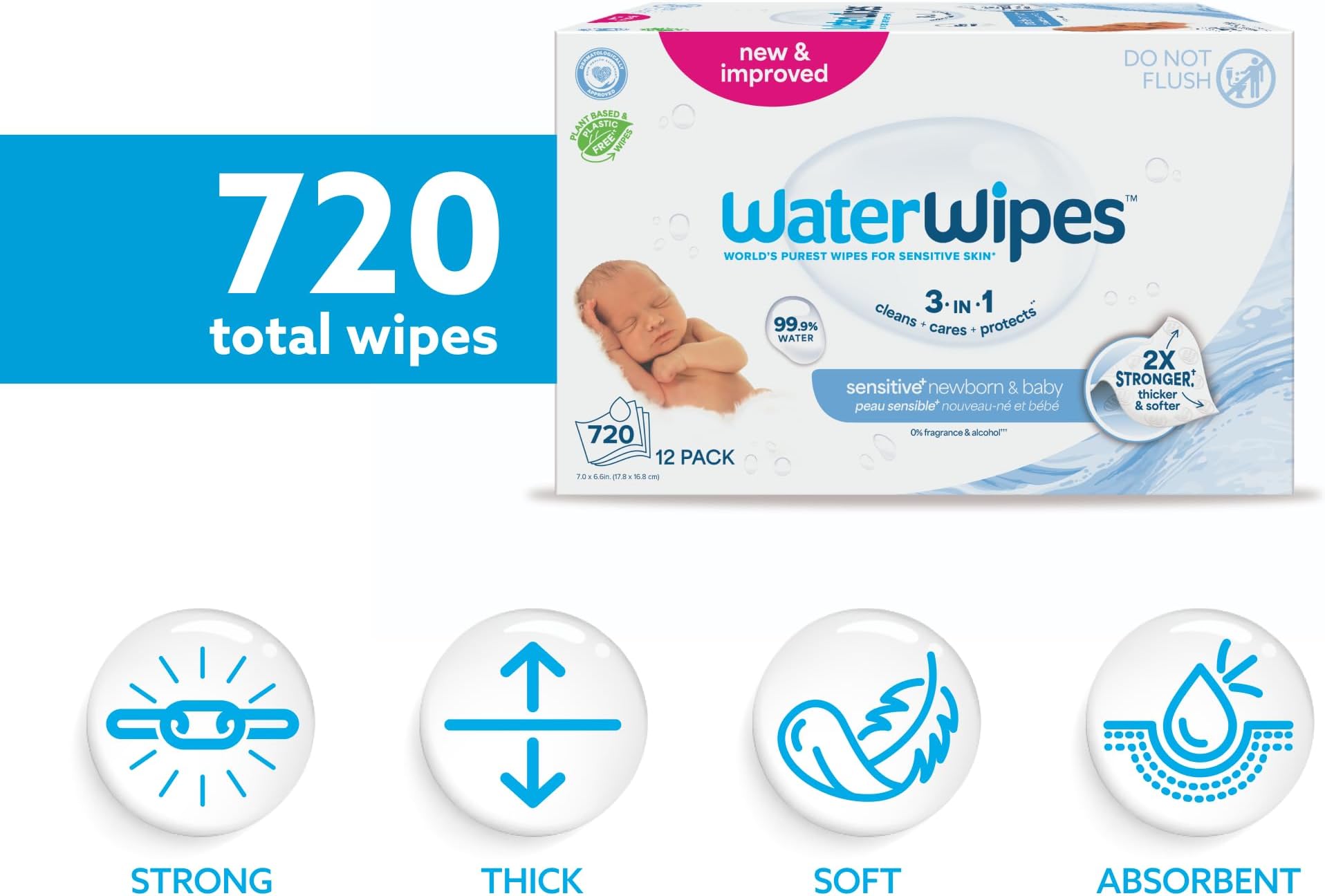 מגבונים לתינוקות ולילודים WaterWipes Sensitive+, 3 ב-1 מנקה, מטפל, מגן, 99.9% מים, ללא ריח והיפואלרגני, 720 יחידות (12 חבילות)